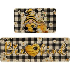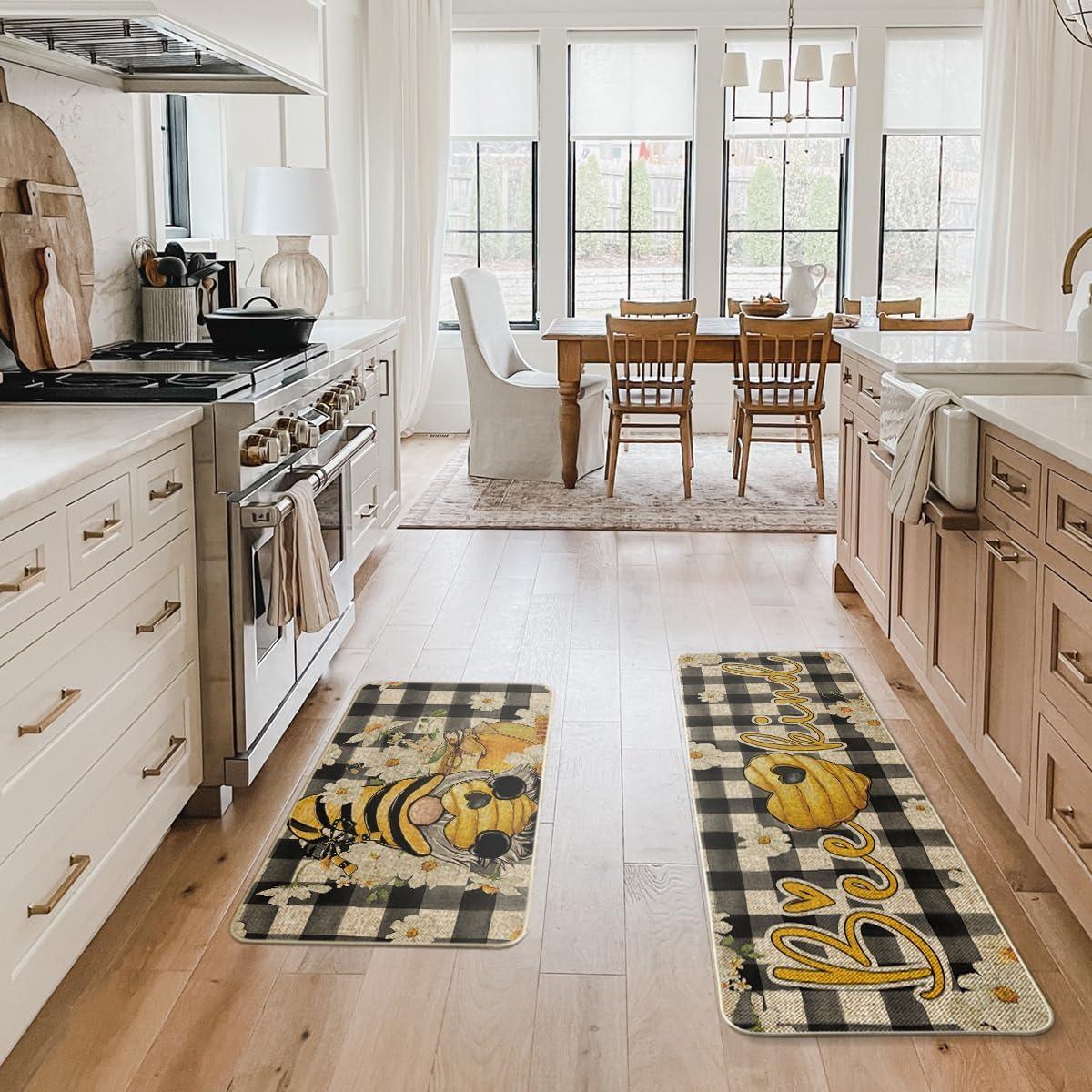 Artoid Mode Buffalo Plaid Gnome Bee Kind Honey Summer Kitchen Mats Set of 2, Daisy Spring Home Decor Low-Profile Kitchen Rugs for Floor – 17×29 and 17×47 Inch