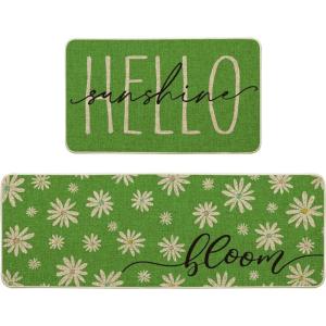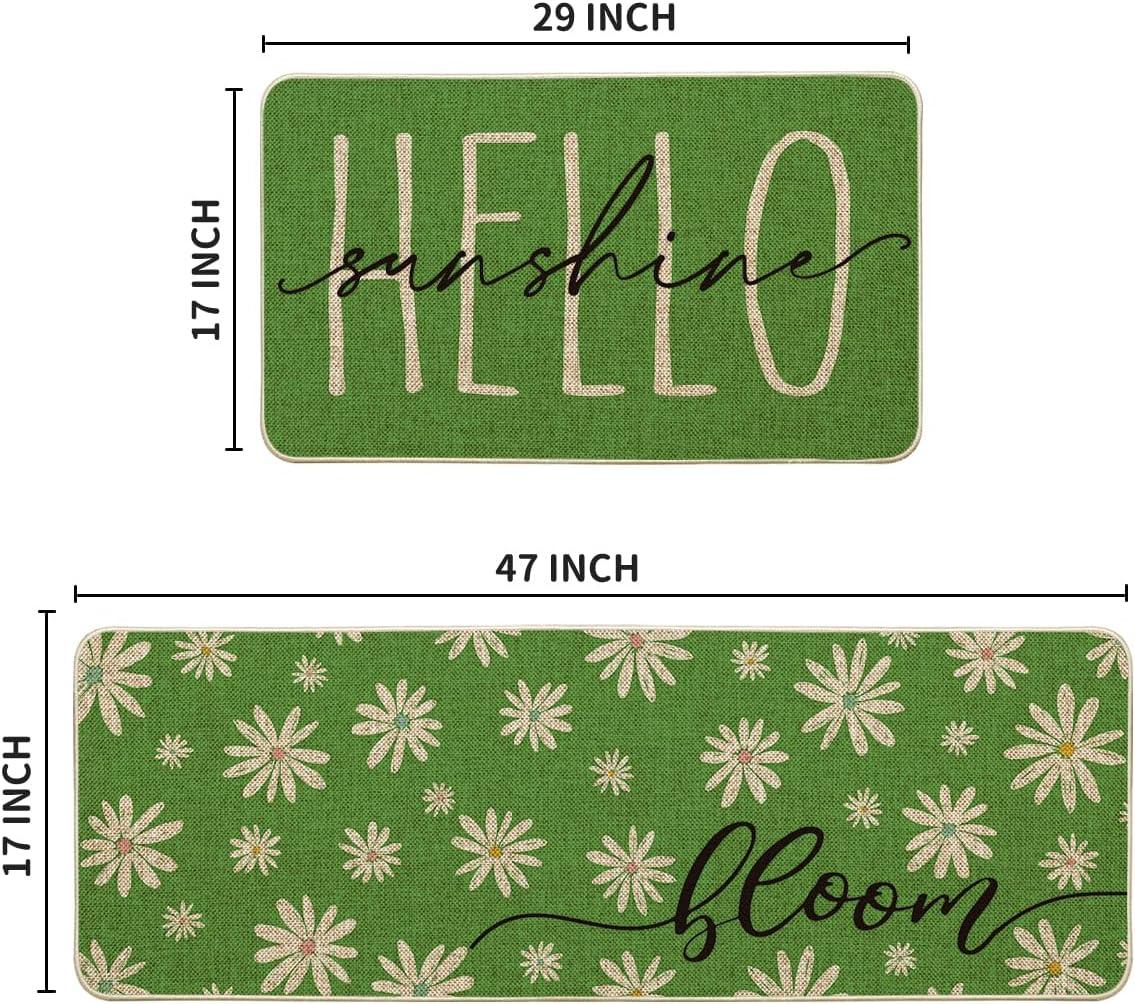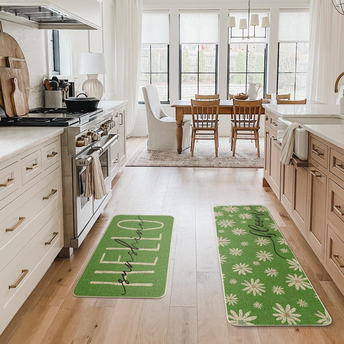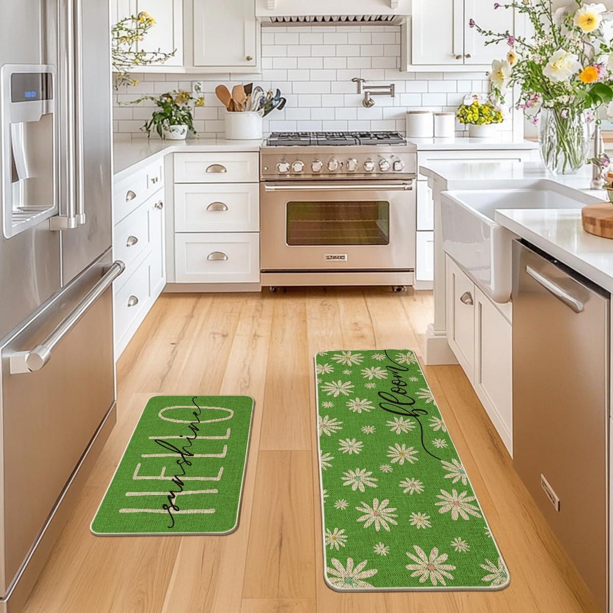 Artoid Mode Yellow Daisy Hello Sunshine Bloom Spring Kitchen Mats Set of 2, Home Decor Low-Profile Kitchen Rugs for Floor – 17×29 and 17×47 Inch(Green)