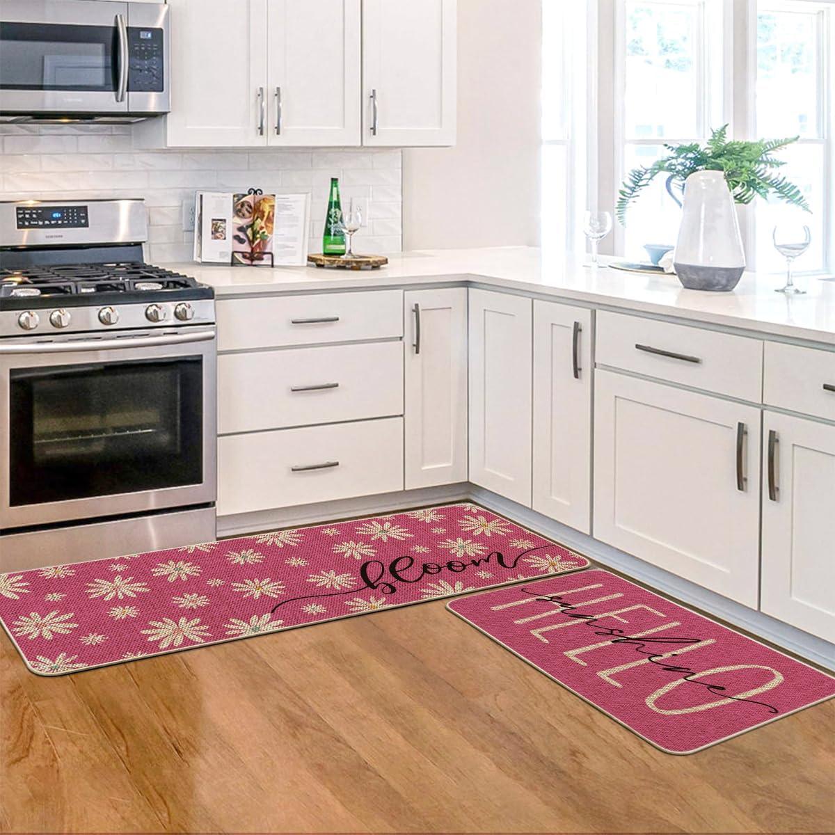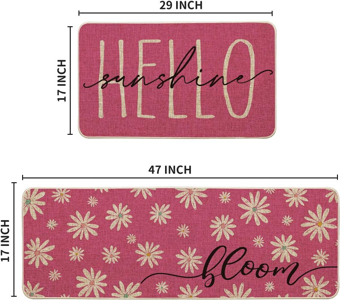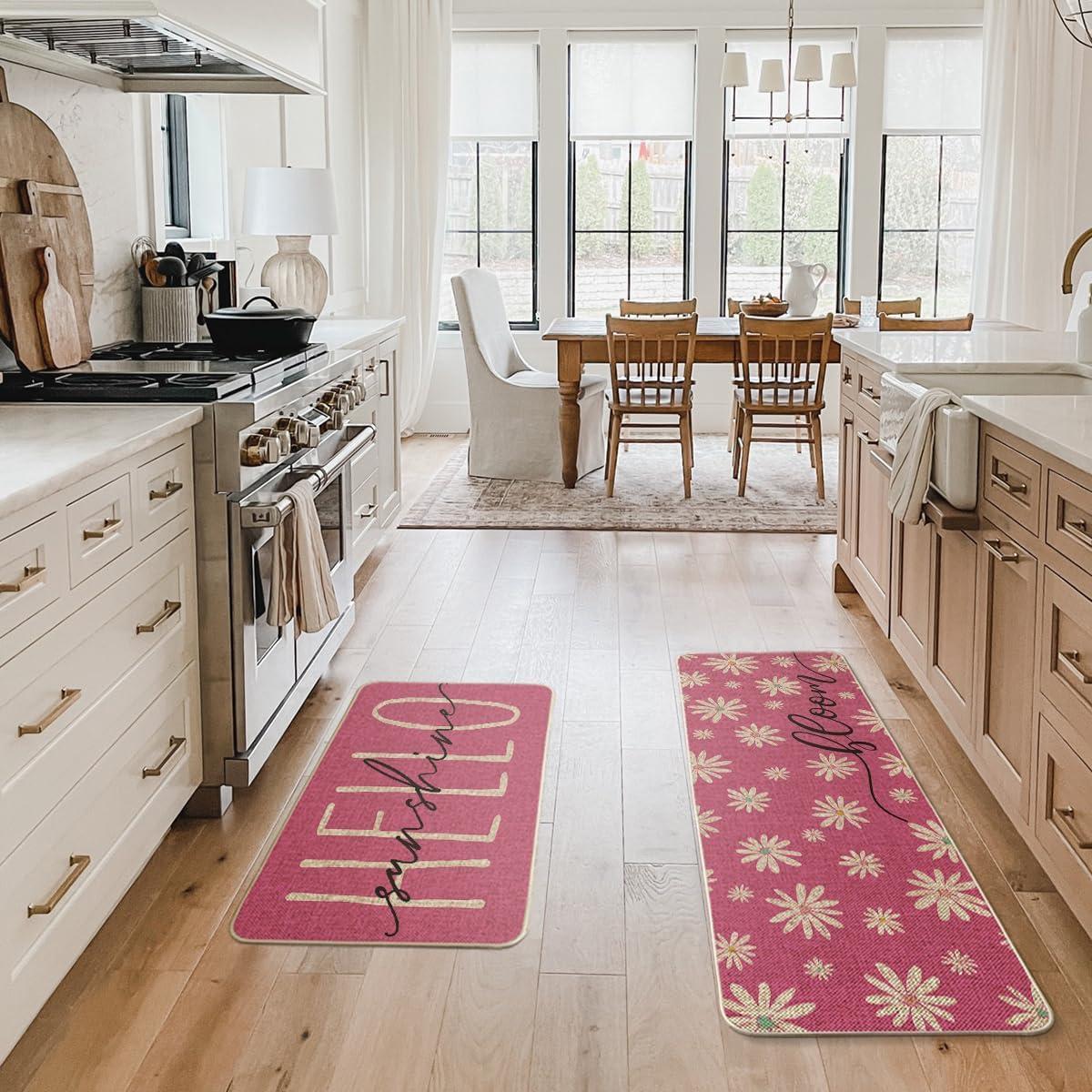Artoid Mode Blue Daisy Hello Sunshine Bloom Spring Kitchen Mats Set of 2, Home Decor Low-Profile Kitchen Rugs for Floor – 17×29 and 17×47 Inch(Pink)