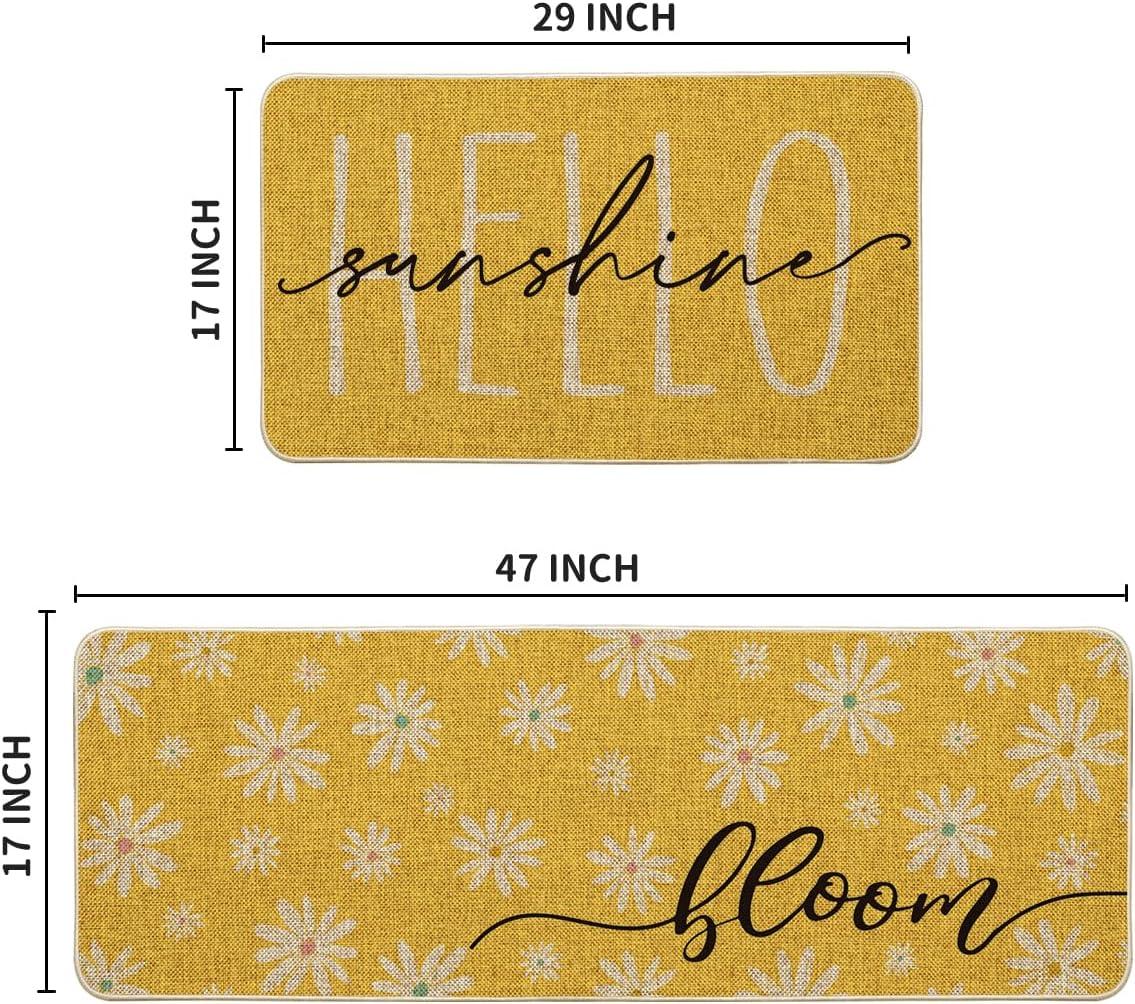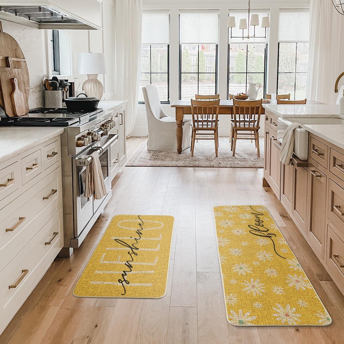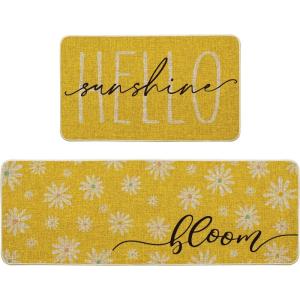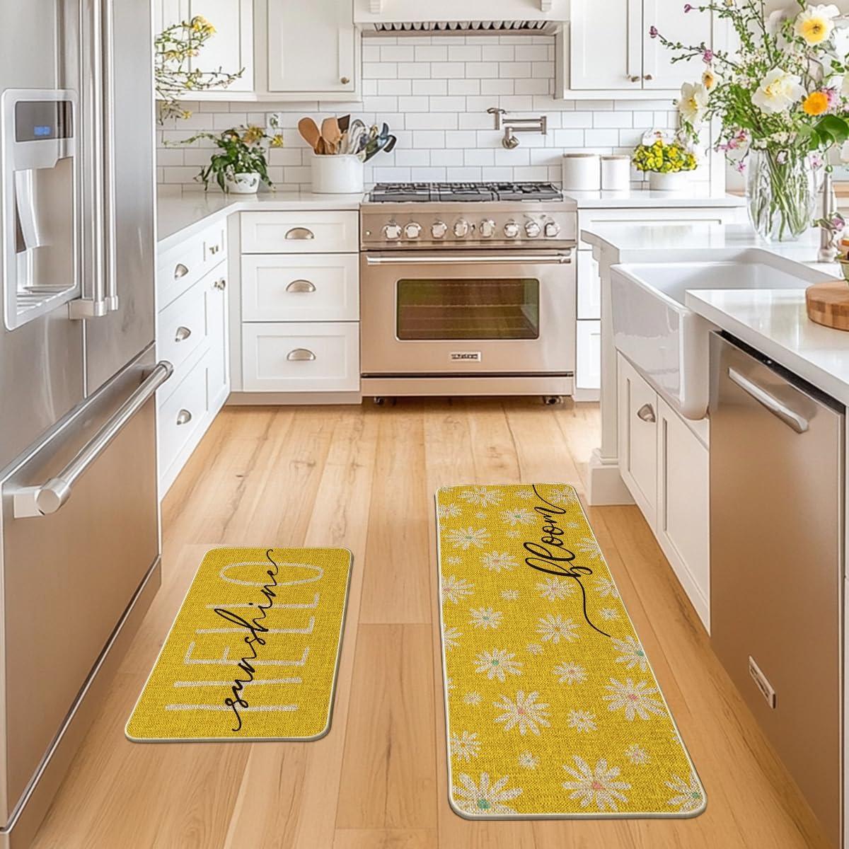 Artoid Mode Yellow Daisy Hello Sunshine Bloom Spring Kitchen Mats Set of 2, Home Decor Low-Profile Kitchen Rugs for Floor – 17×29 and 17×47 Inch(Yellow)