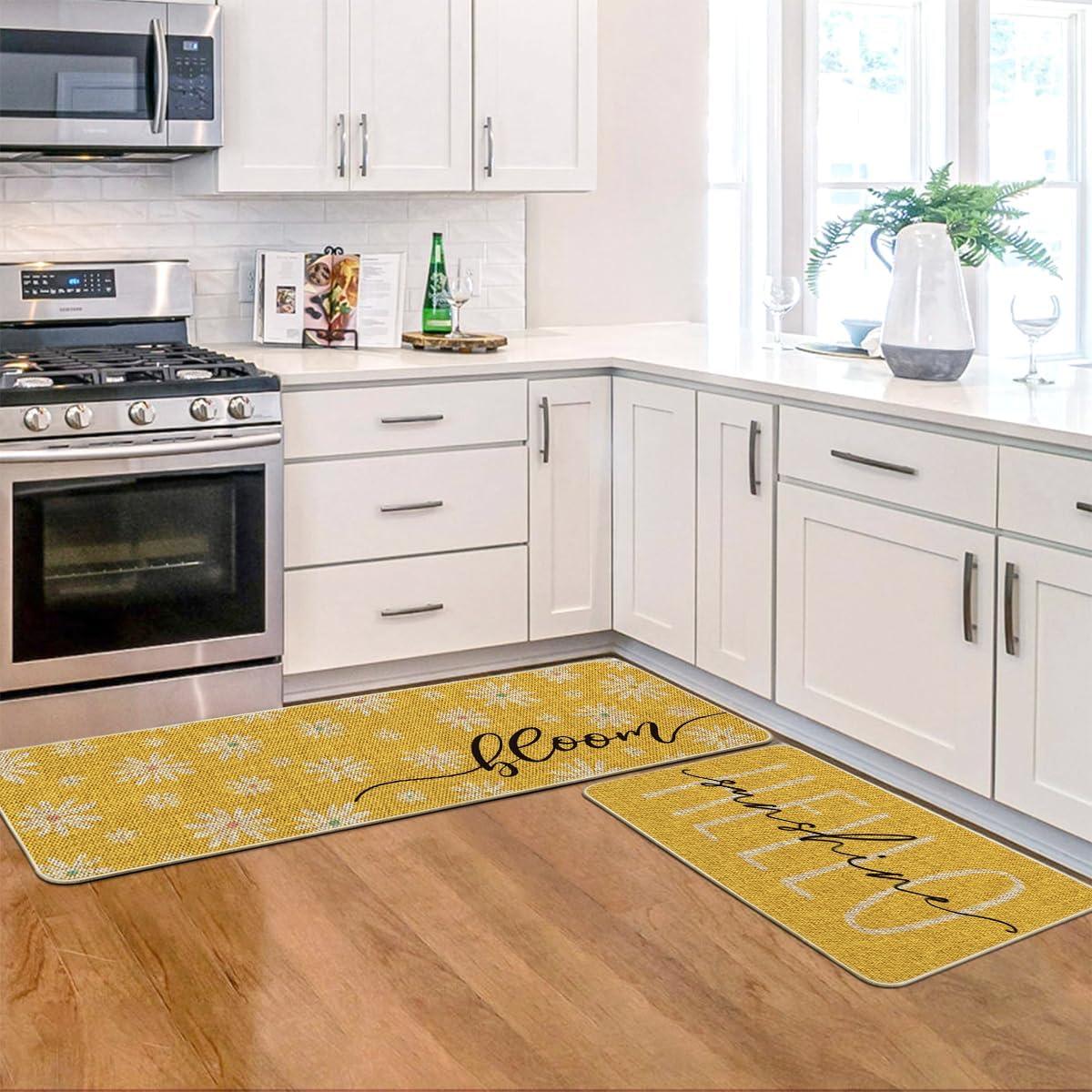 Artoid Mode Blue Daisy Hello Sunshine Bloom Spring Kitchen Mats Set of 2, Home Decor Low-Profile Kitchen Rugs for Floor – 17×29 and 17×47 Inch(Yellow)