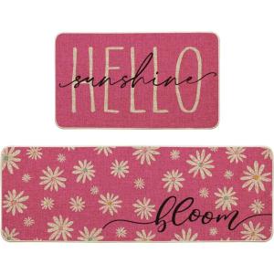 Artoid Mode Yellow Daisy Hello Sunshine Bloom Spring Kitchen Mats Set of 2, Home Decor Low-Profile Kitchen Rugs for Floor – 17×29 and 17×47 Inch(Pink)