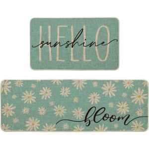 Artoid Mode Blue Daisy Hello Sunshine Bloom Spring Kitchen Mats Set of 2, Home Decor Low-Profile Kitchen Rugs for Floor – 17×29 and 17×47 Inch(Green)