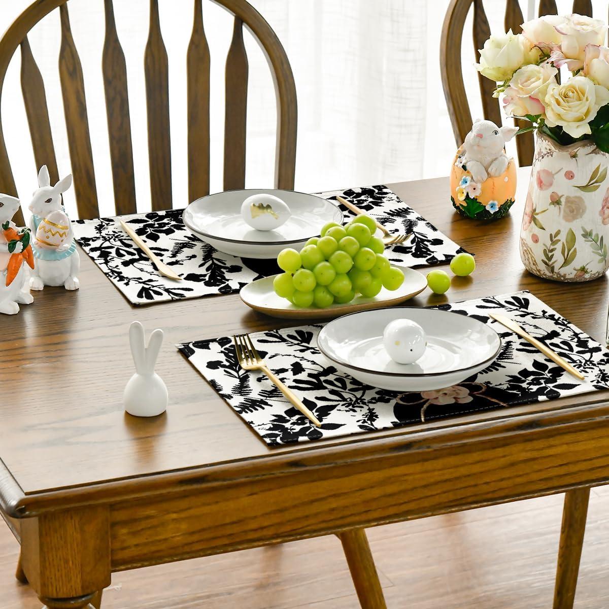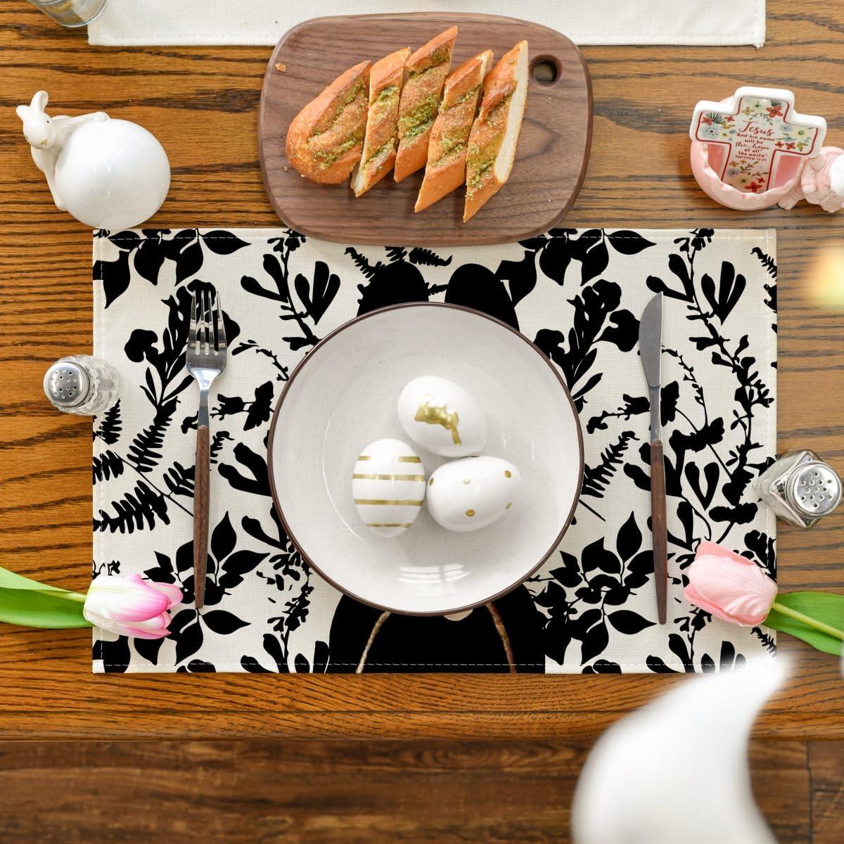 Artoid Mode Black Bunny Leaves Bow Easter Placemats Set of 4, 12×18 Inch Spring Table Mats for Outdoor Home Party Kitchen Dining Decor(Black/Beige)