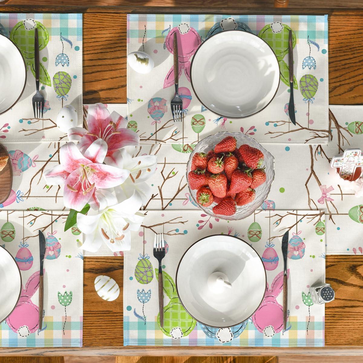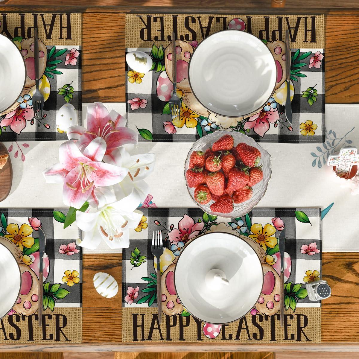Artoid Mode Buffalo Plaid Bunny Egg Flowers Happy Easter Place Mats 12×18 Inch Set of 4 and Table Runner 13×72 Inch
