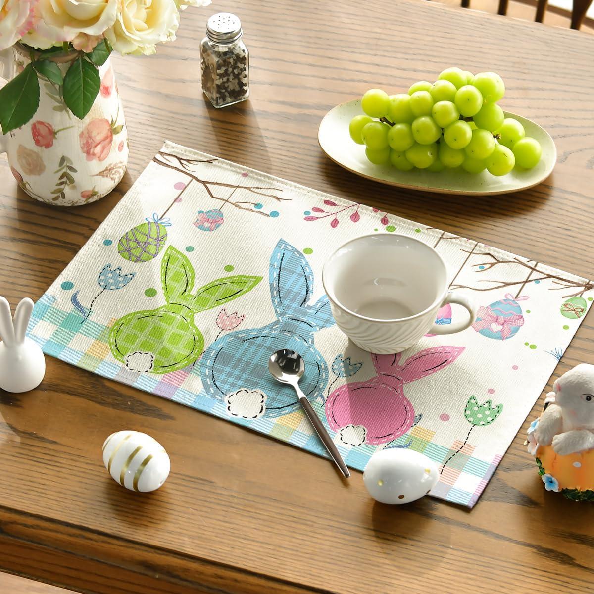 Artoid Mode Buffalo Plaid Bunny Rabbits Happy Easter Placemats Set of 4, 12×18 Inch Seasonal Flower Table Mats for Party Kitchen Dining Decoration