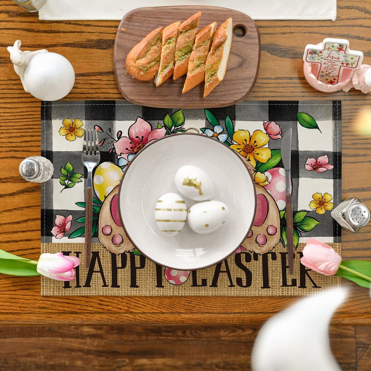 Artoid Mode Buffalo Plaid Bunny Egg Flowers Happy Easter Placemats Set of 4, 12×18 Inch Spring Seasonal Table Mats for Party Kitchen Dining Decoration