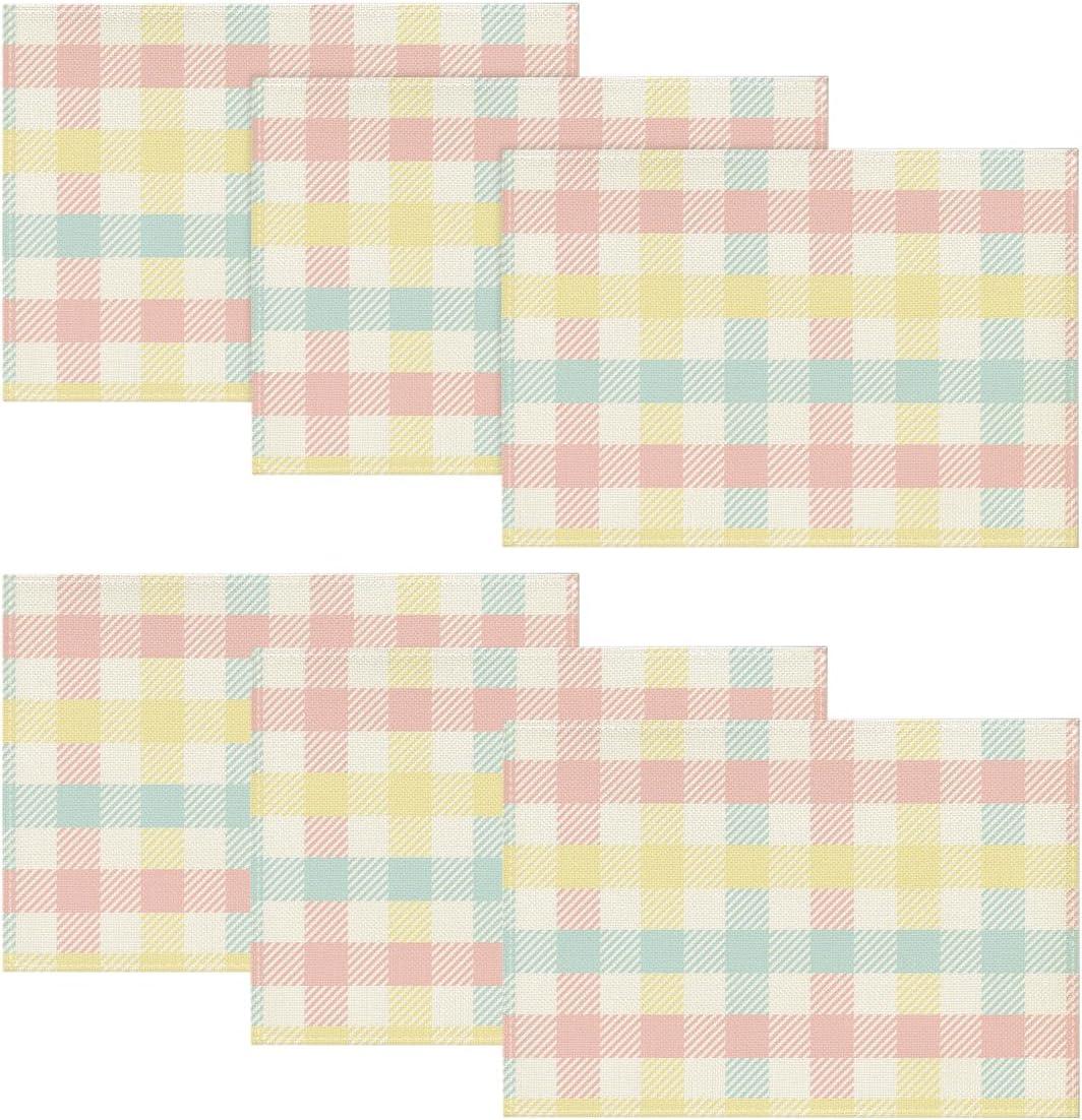 Artoid Mode Blue Pink Yellow Buffalo Plaid Placemats Set of 6, 12×18 Inch Seasonal Easter Table Mats for Party Kitchen Dining Decoration(Pink/Blue)