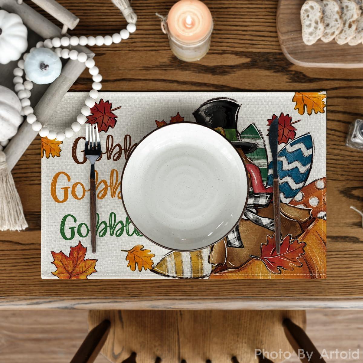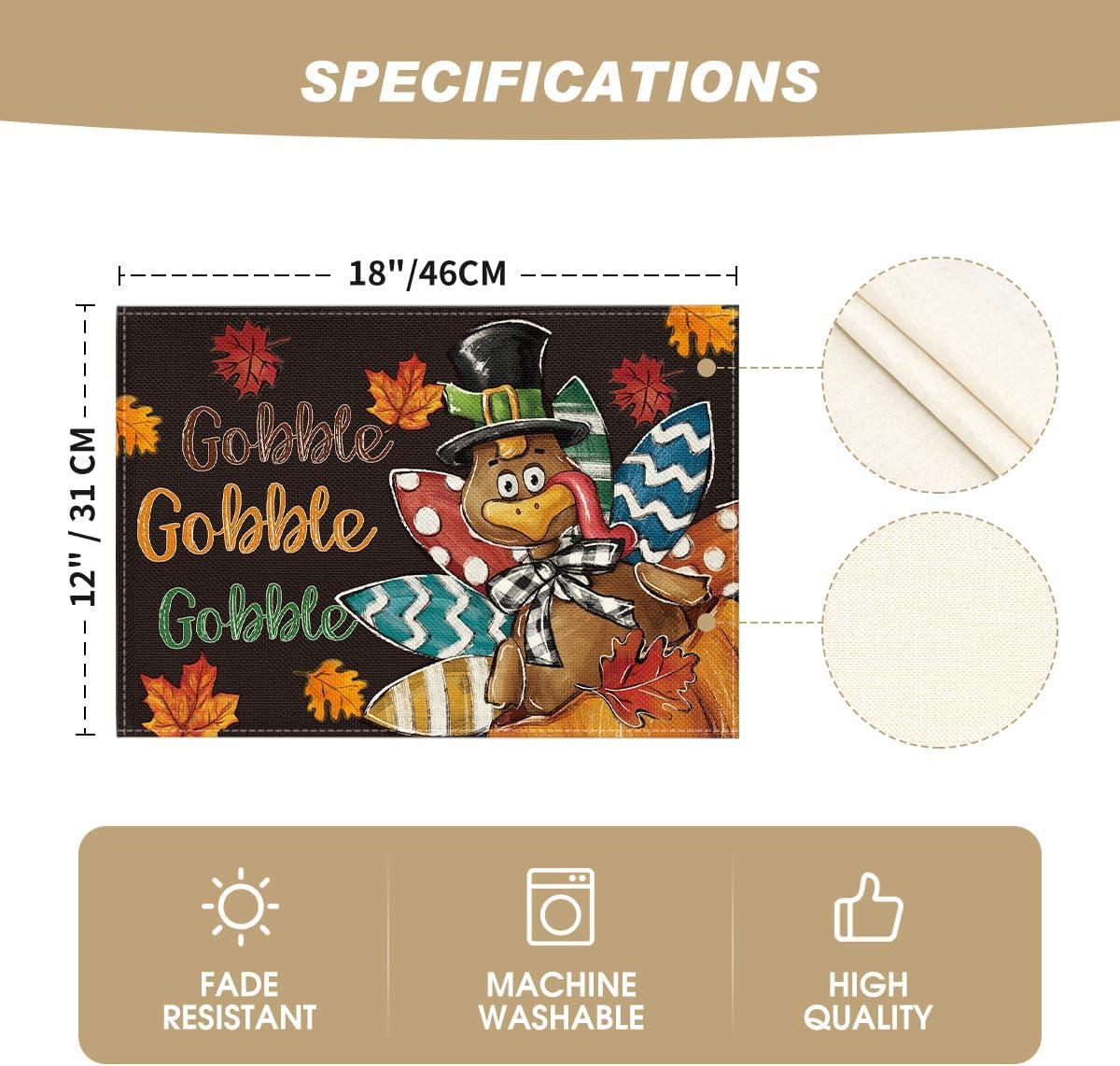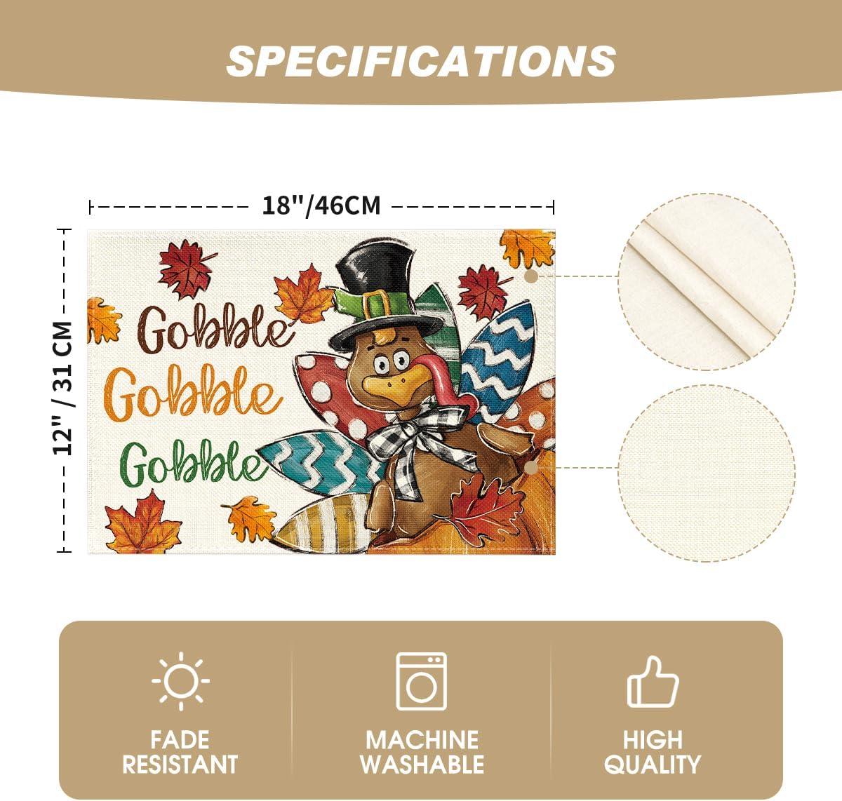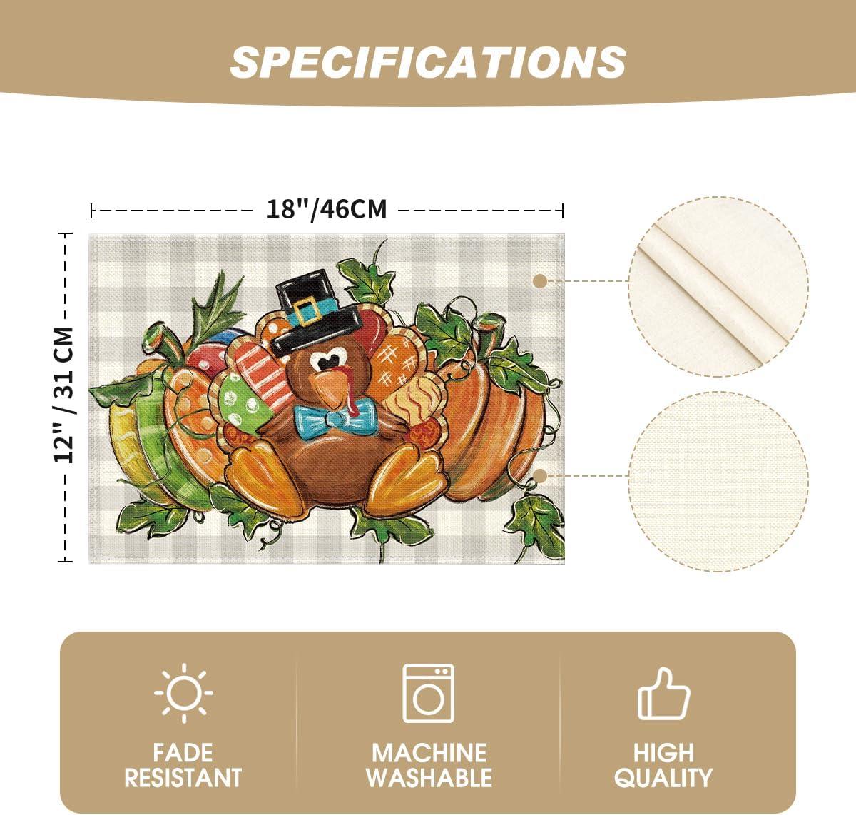 Artoid Mode Turkey Harvest Thanksgiving Placemats Set of 4, 12×18 Inch Seasonal Table Mats for Party Kitchen Dining Decoration