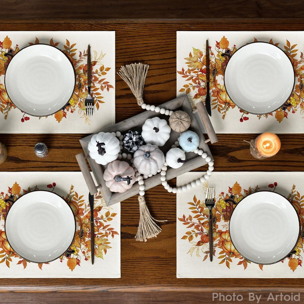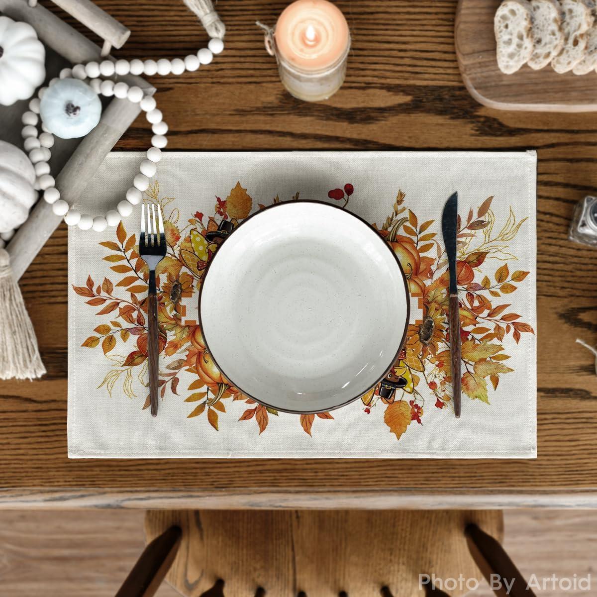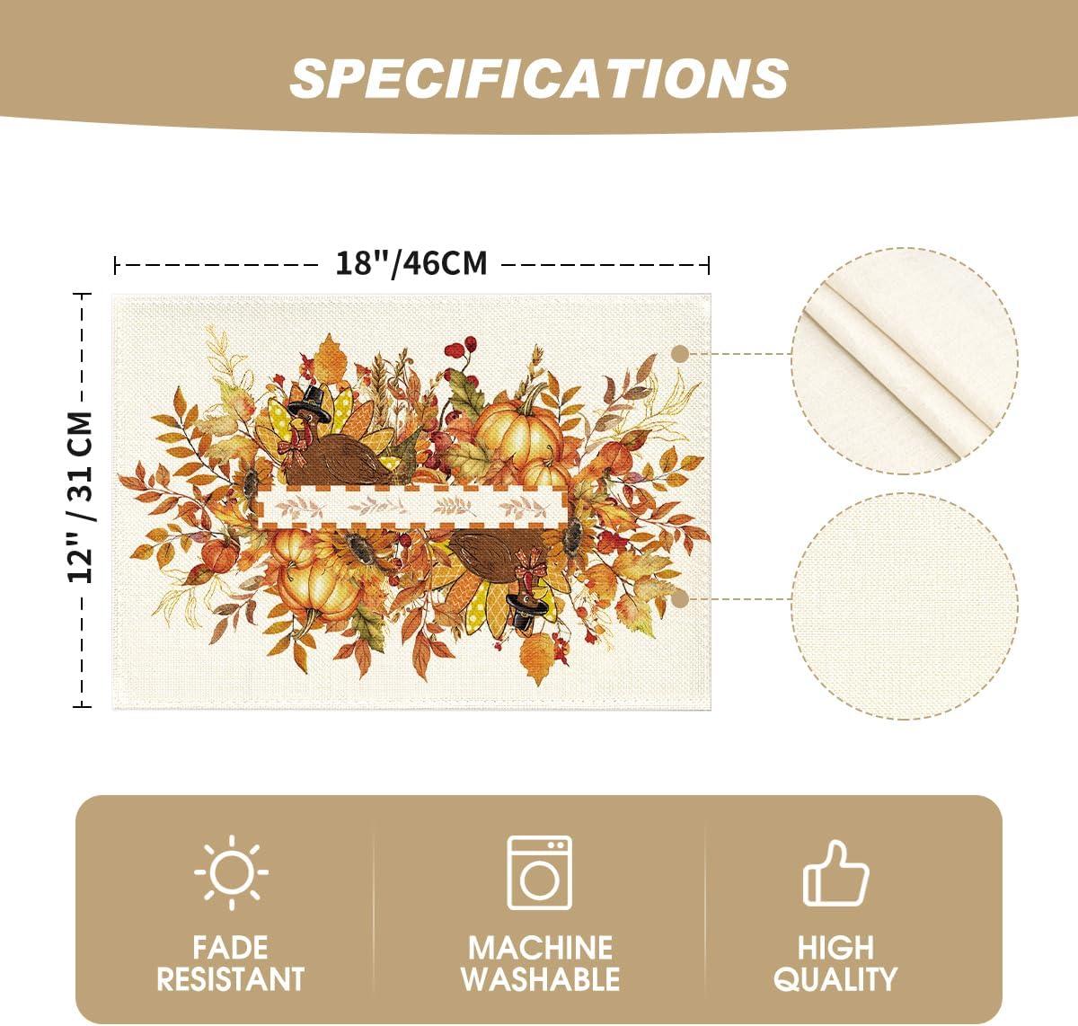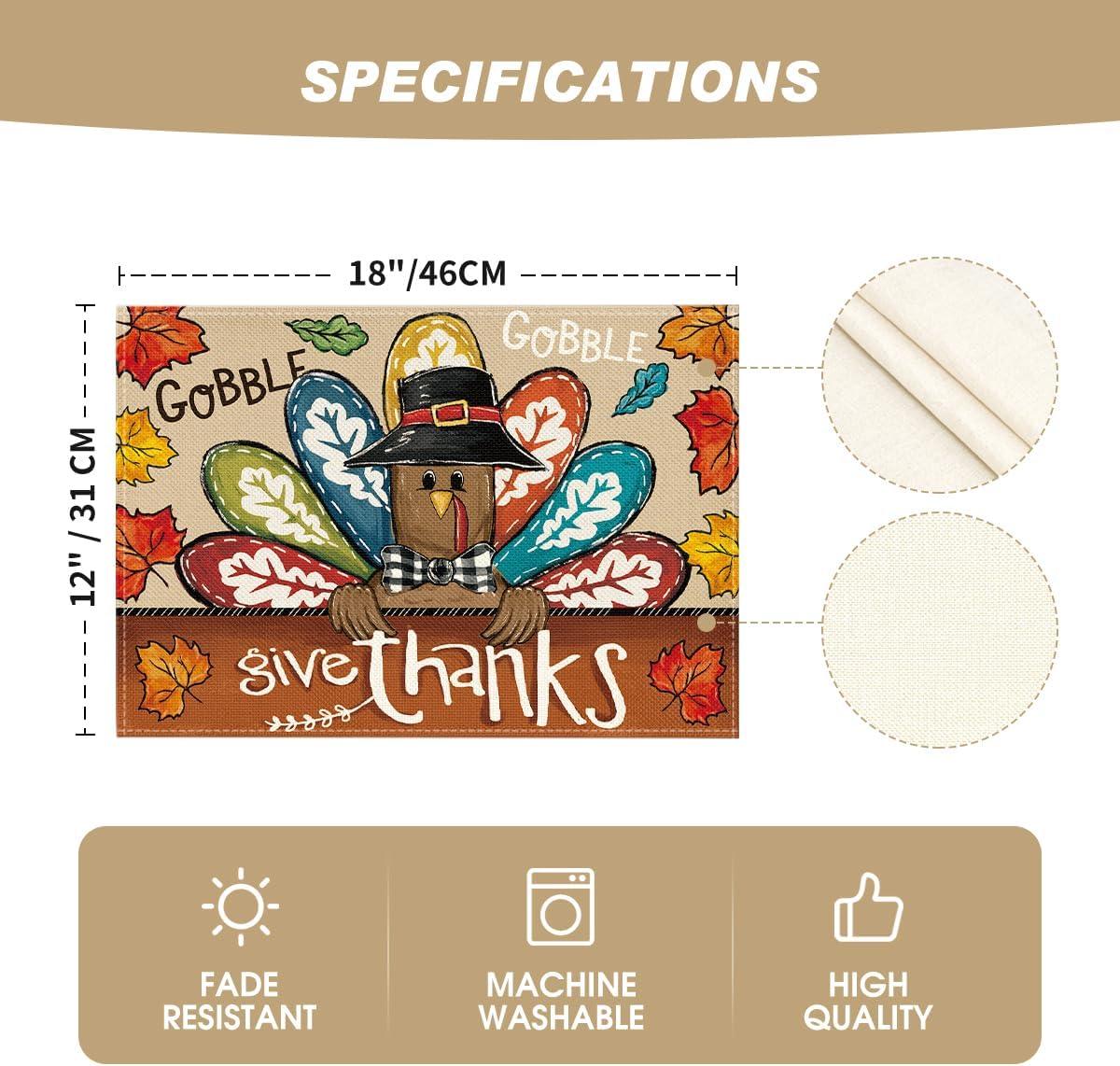 Artoid Mode Turkey Harvest Thanksgiving Placemats Set of 4, 12×18 Inch Seasonal Table Mats for Party Kitchen Dining Decoration
