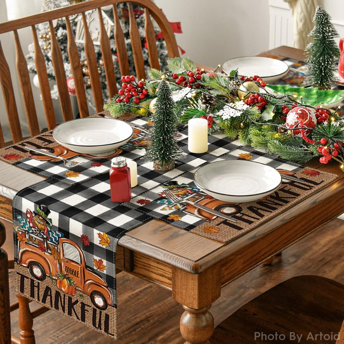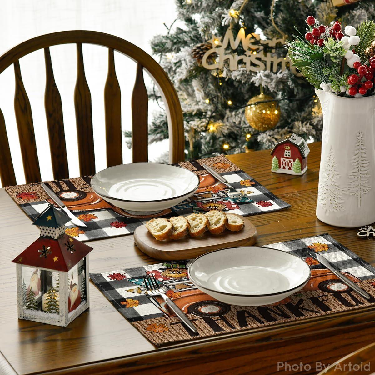 Artoid Mode Buffalo Plaid Truck Turkey Thankful Fall Placemats Set of 6, 12×18 Inch Autumn Thanksgiving Table Mats for Party Kitchen Dining Decoration(Black/Beige)