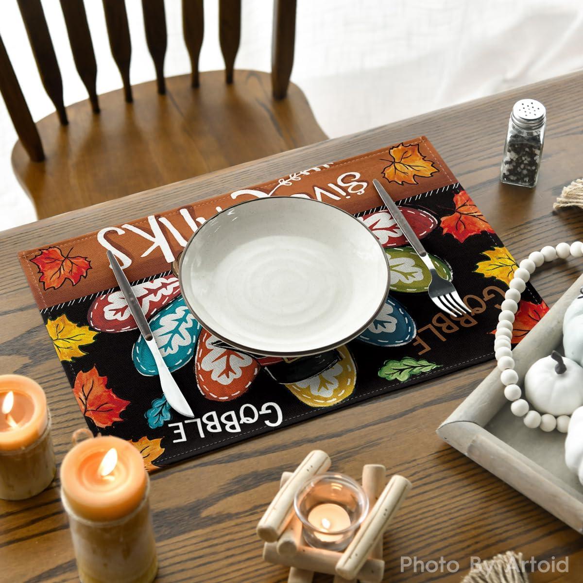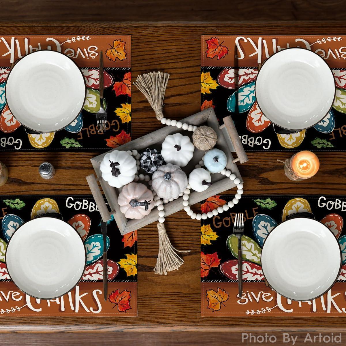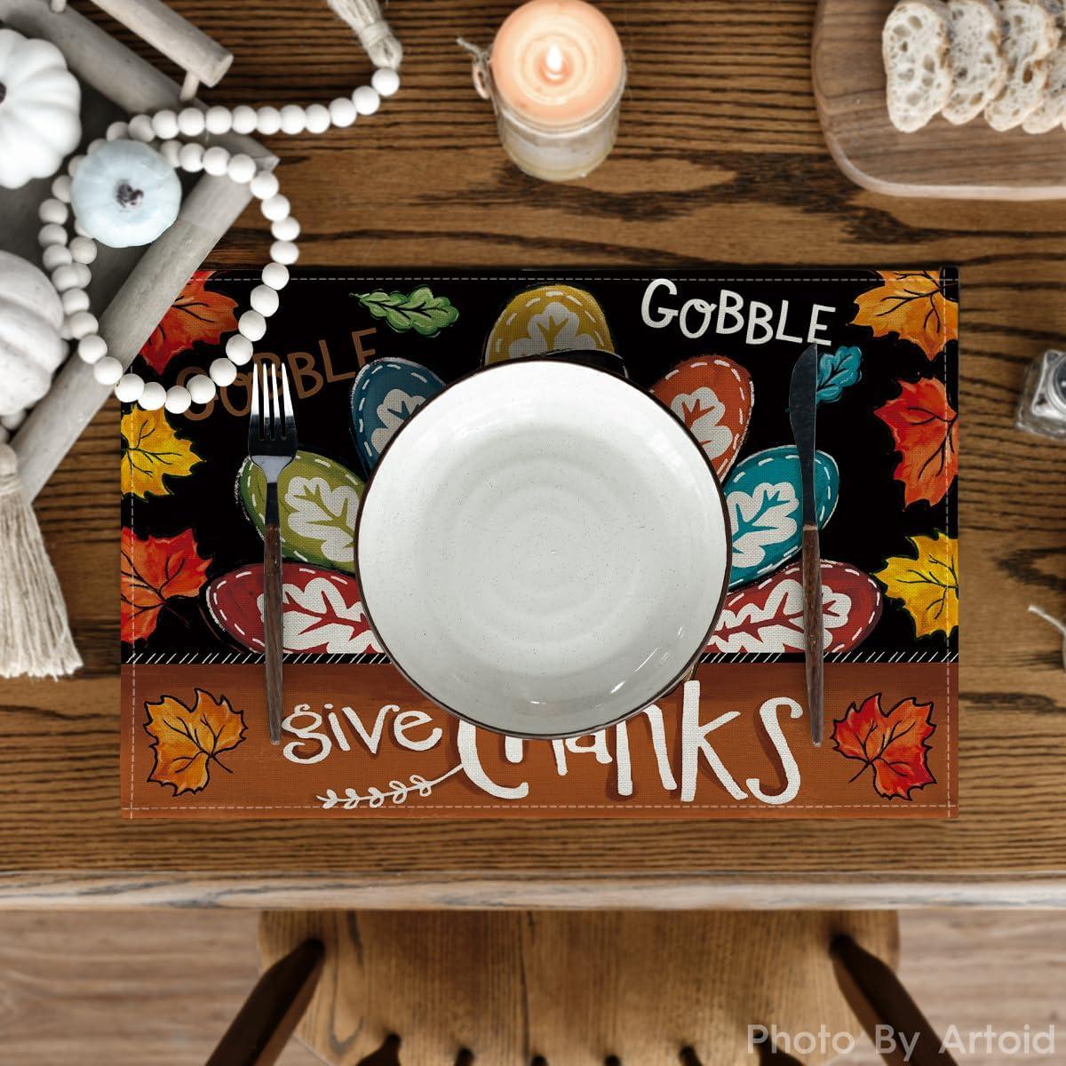 Artoid Mode Gobble Turkey Maple Leaves Thanksgiving Placemats Set of 4, 12×18 Inch Fall Harvest Table Mats for Party Kitchen Dining Decoration(Black)
