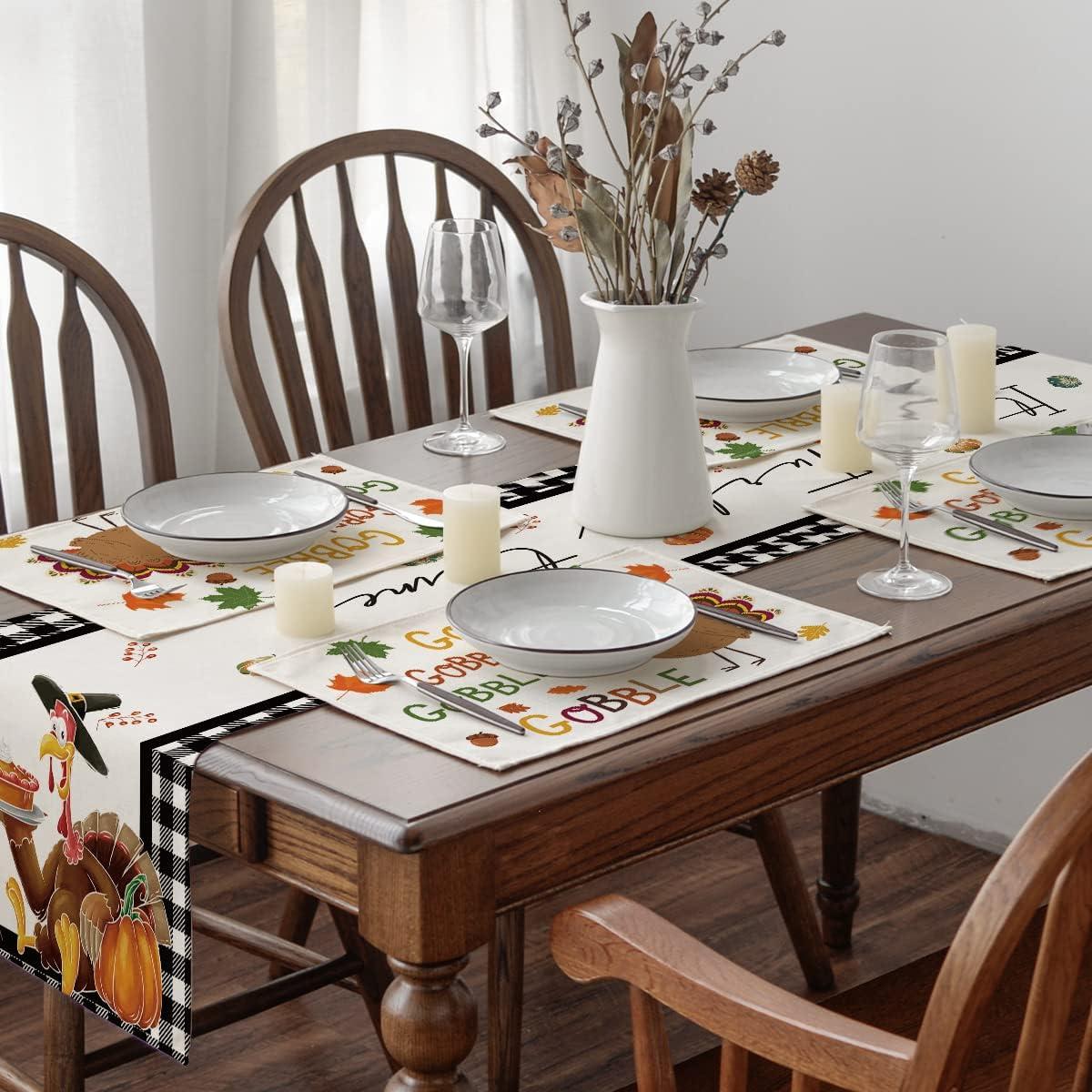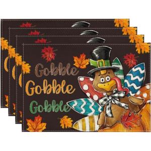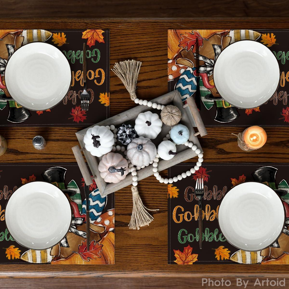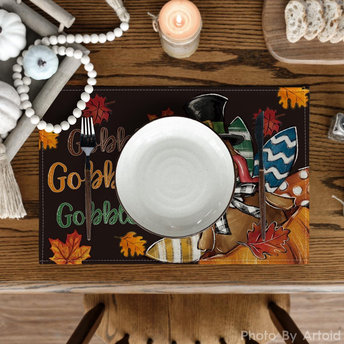 Artoid Mode Gobble Turkey Maple Leaves Thanksgiving Placemats Set of 4, 12×18 Inch Fall Harvest Table Mats for Party Kitchen Dining Decoration(Black)