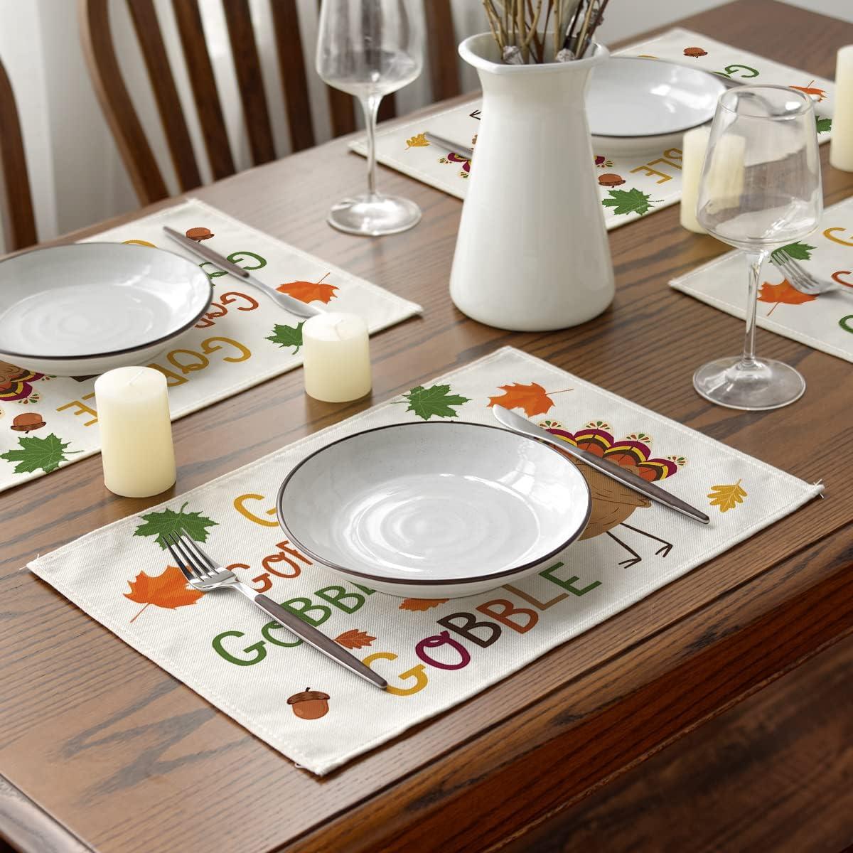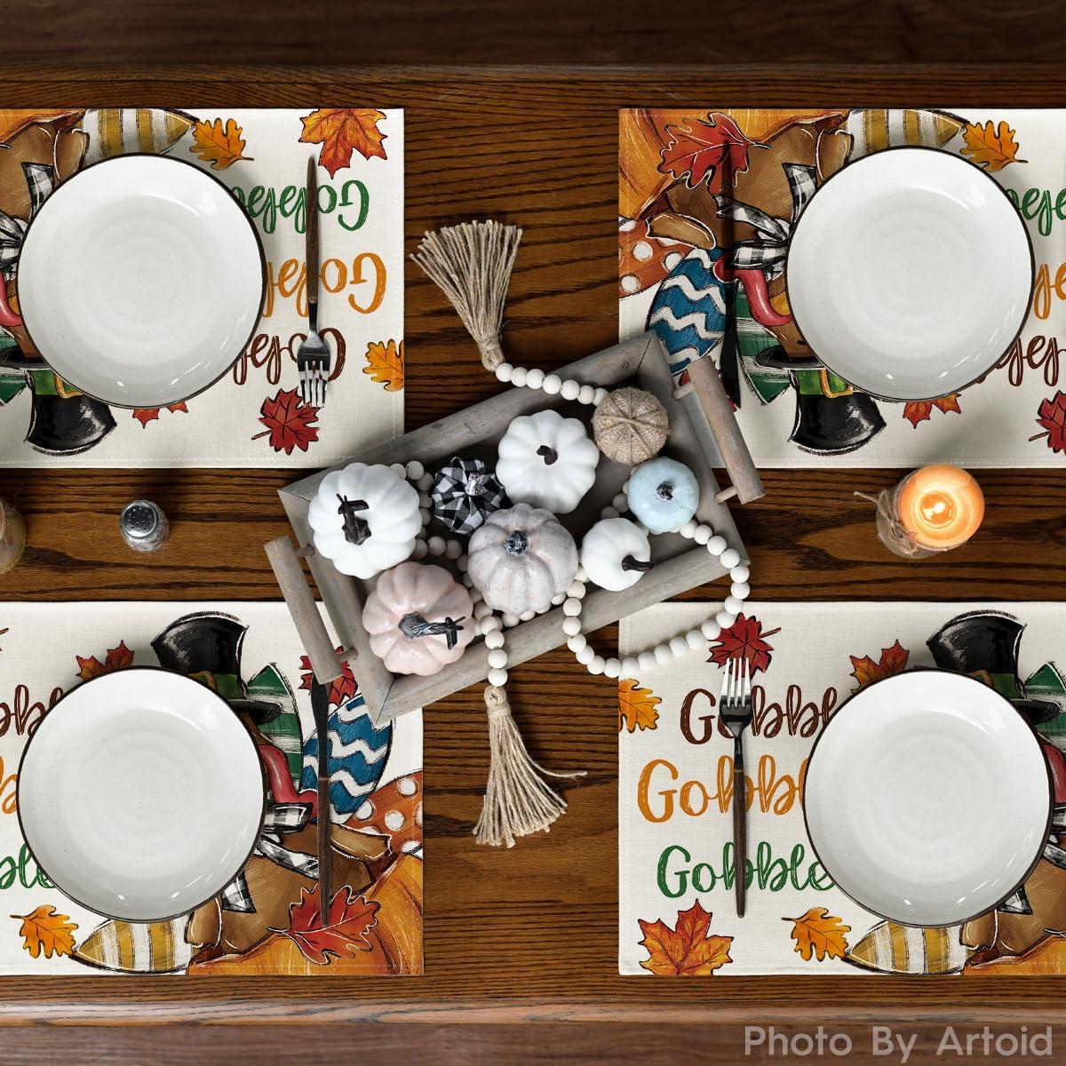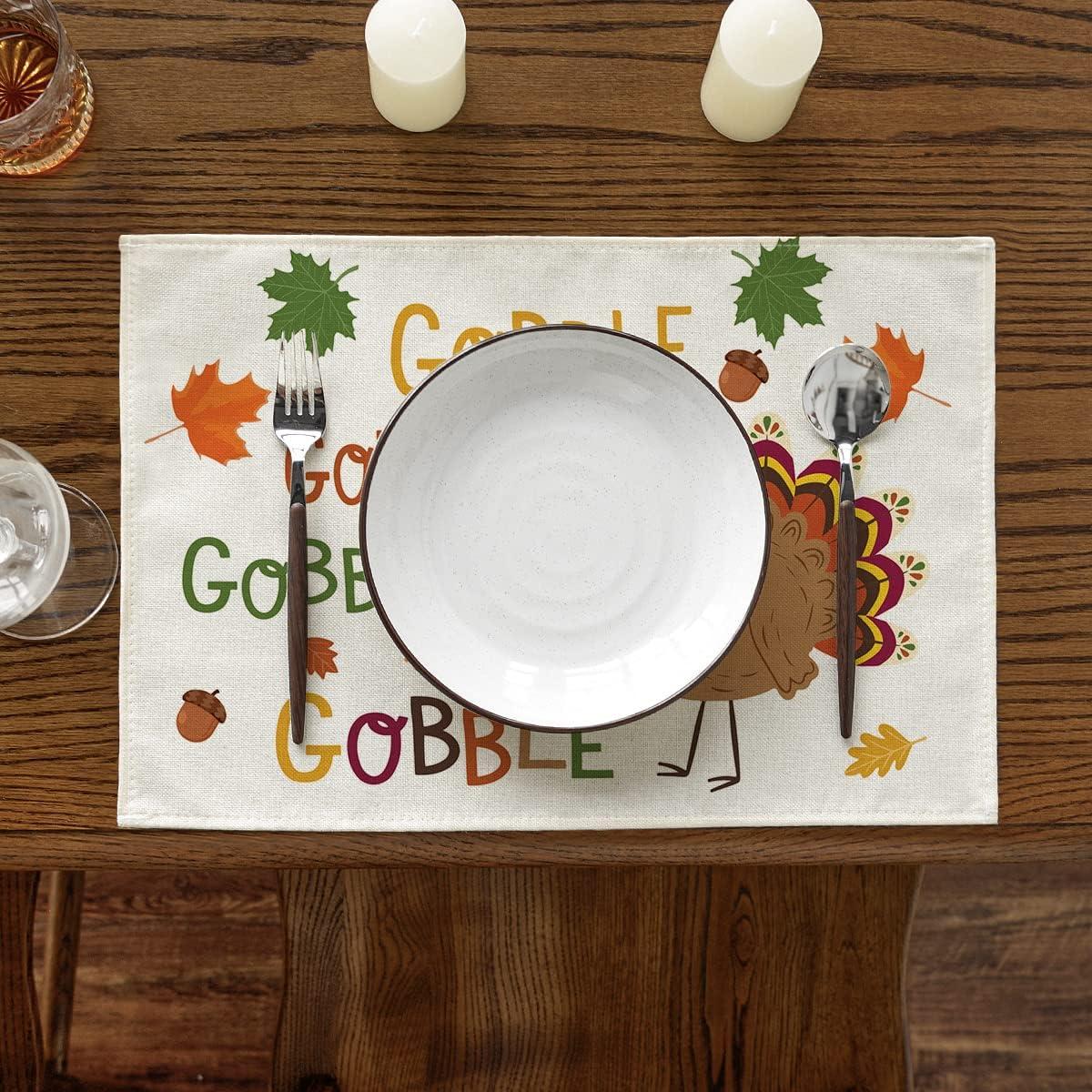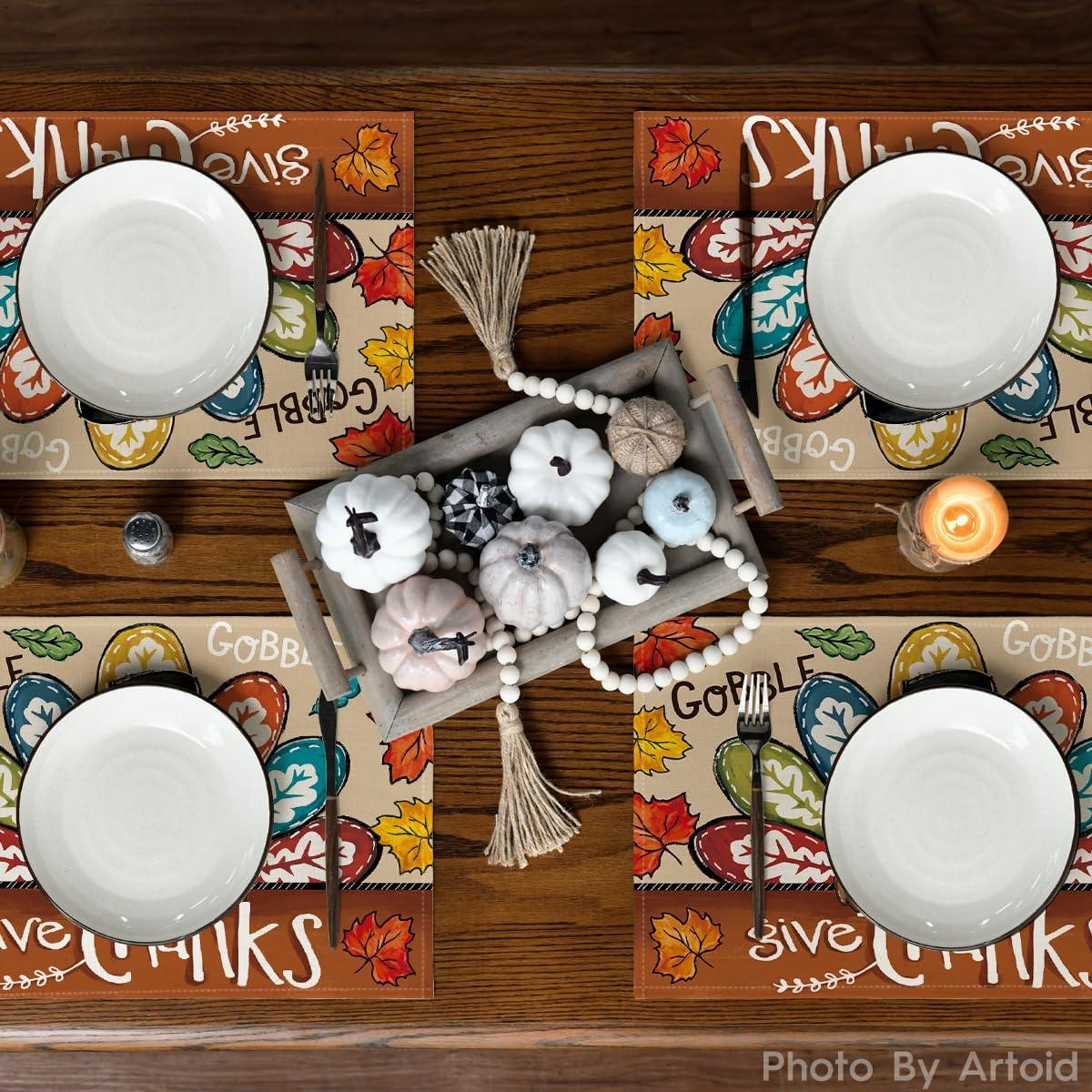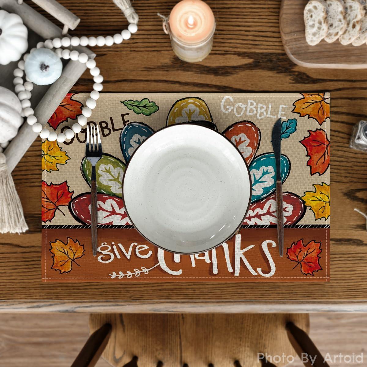 Artoid Mode Gobble Turkey Maple Leaves Thanksgiving Placemats Set of 4, 12×18 Inch Fall Harvest Table Mats for Party Kitchen Dining Decoration(Brown/Beige)