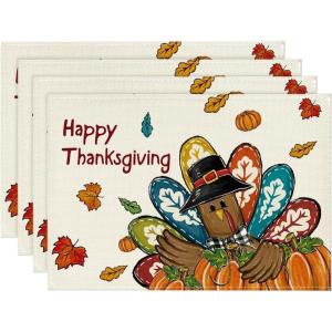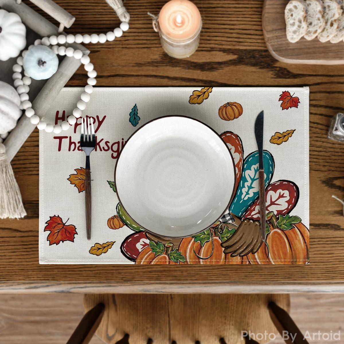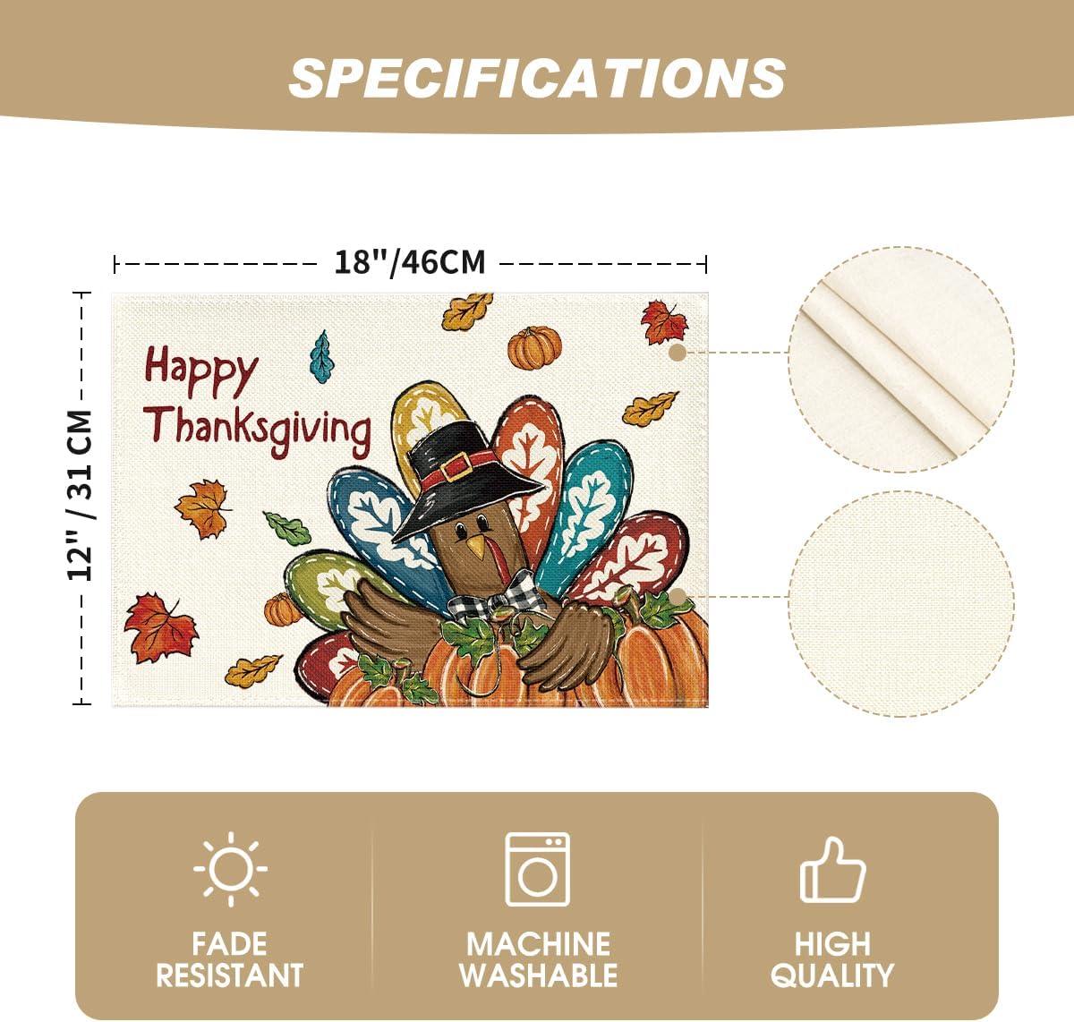 Artoid Mode Turkey Happy Thanksgiving Placemats Set of 4, 12×18 Inch Seasonal Table Mats for Party Kitchen Dining Decoration
