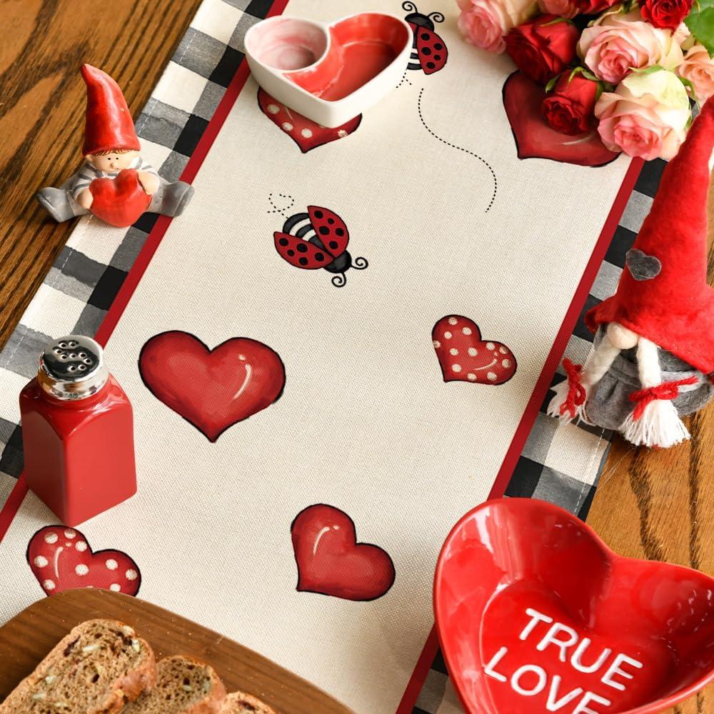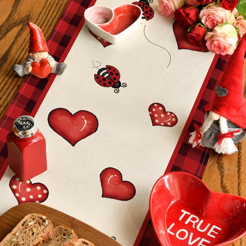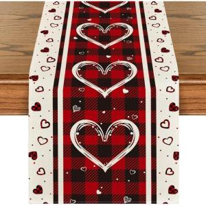 Artoid Mode Buffalo Plaid Love Hearts Valentine’s Day Table Runner, Seasonal Kitchen Dining Table Decoration for Indoor Home Party 13×72 Inch(Red)