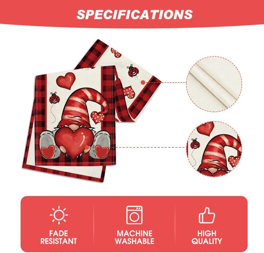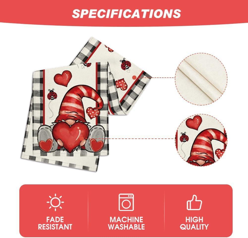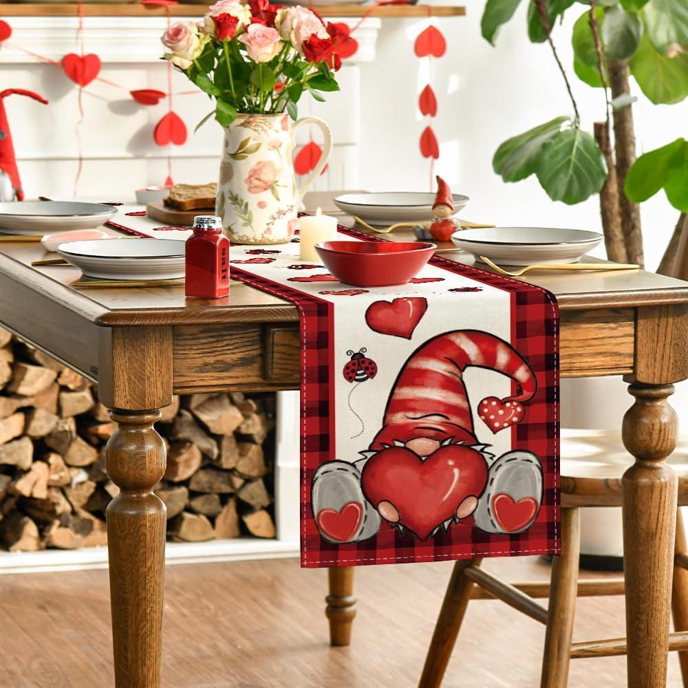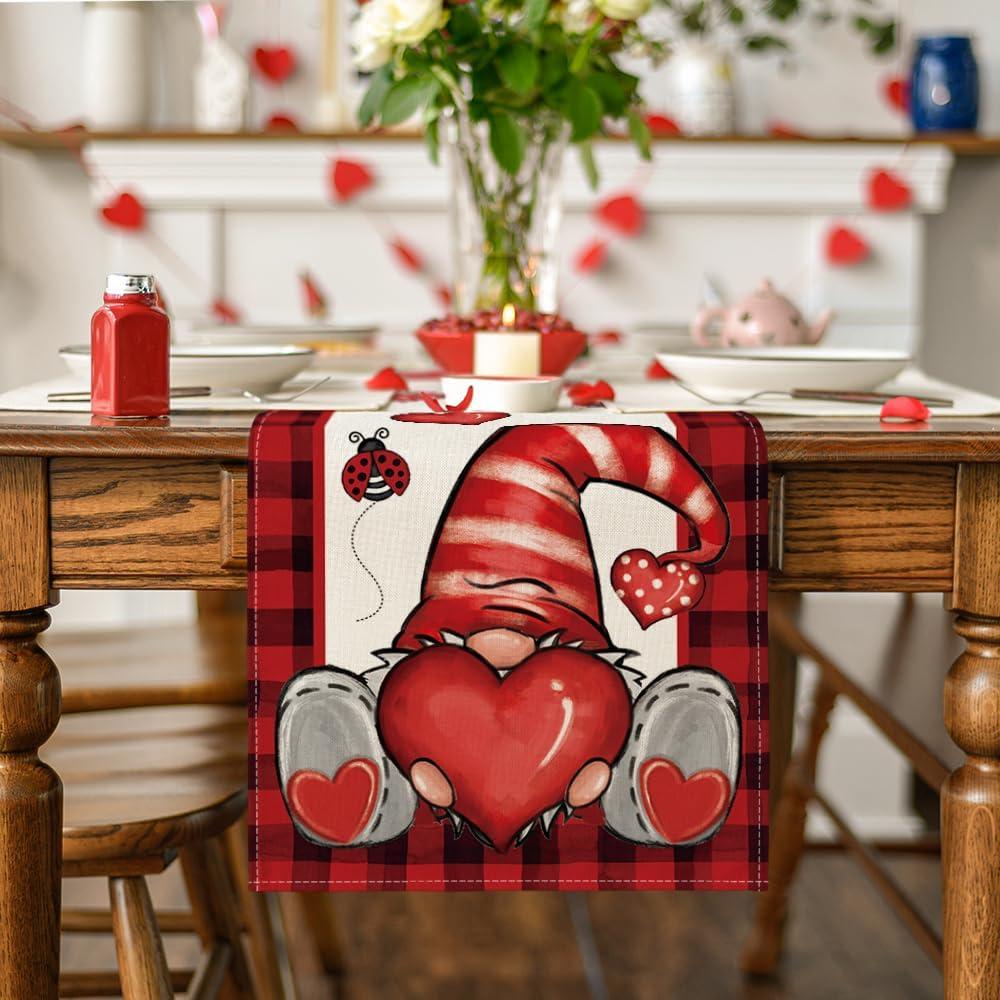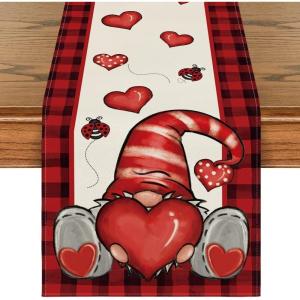 Artoid Mode Buffalo Plaid Gnome Valentine’s Day Table Runner, Holiday Kitchen Dining Table Decoration for Home Party Indoor 13×72 Inch(Red / Black)