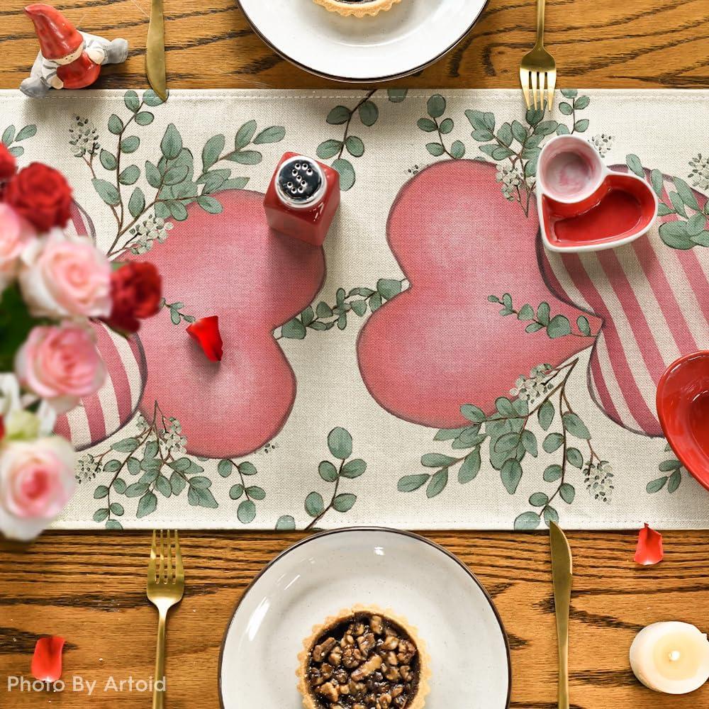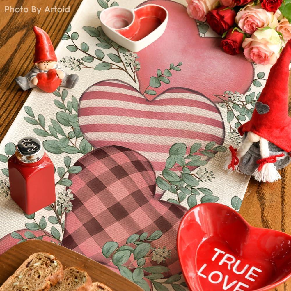 Artoid Mode Eucalyptus Hearts Valentine’s Day Table Runner, Holiday Kitchen Dining Table Decoration for Home Party Indoor 13×72 Inch(Red)