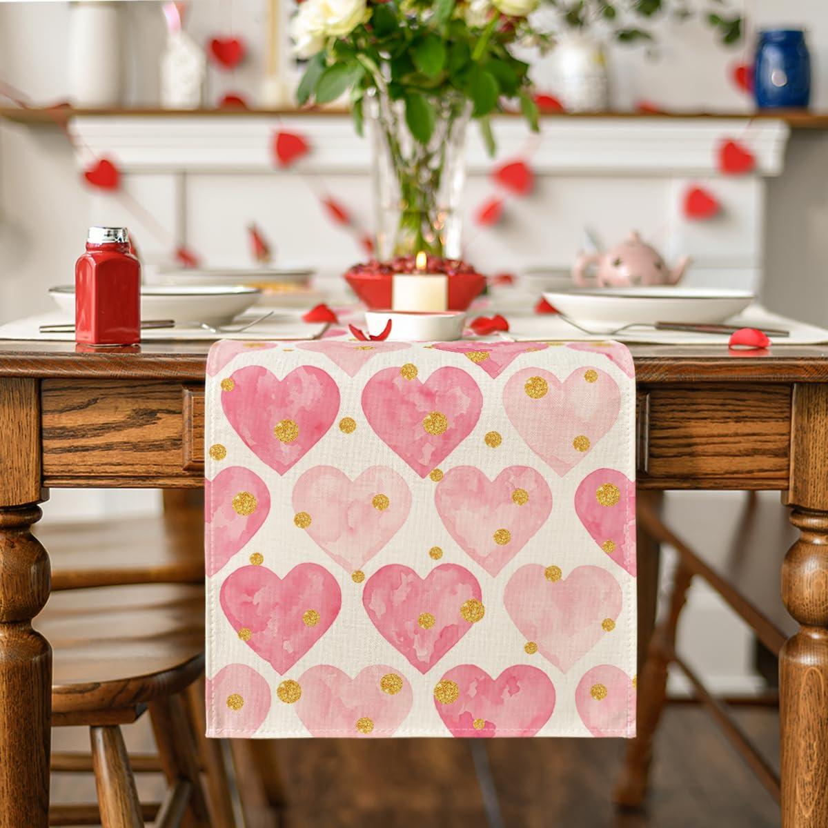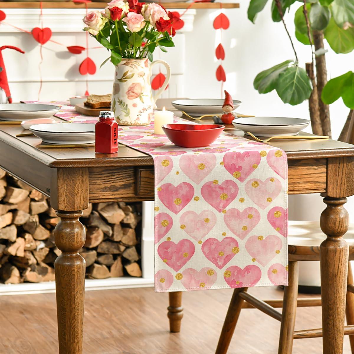 Artoid Mode Golden Pink Love Valentine’s Day Table Runner, Seasonal Anniversary Kitchen Dining Table Decoration for Indoor Home Party 13×72 Inch(Pink)