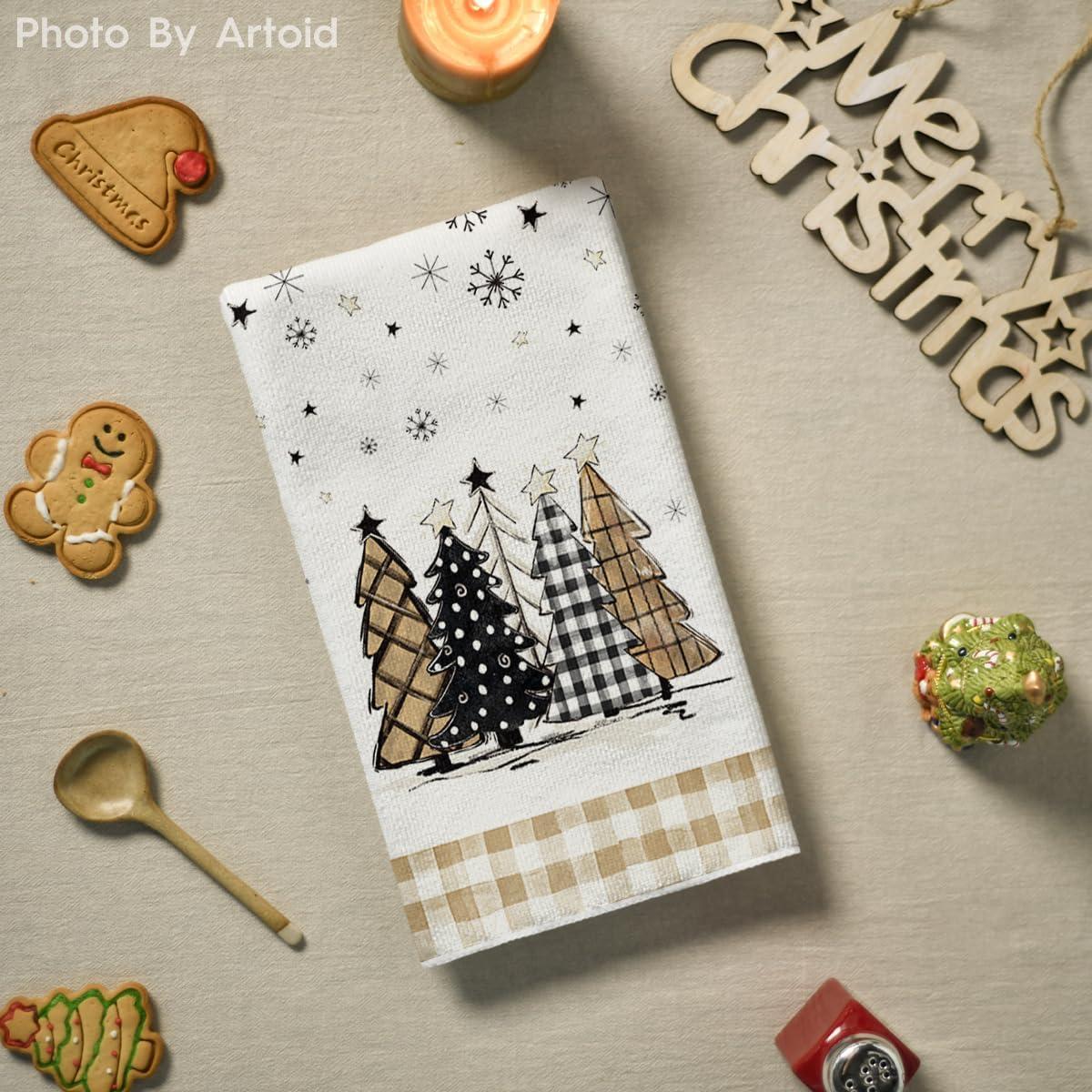 Artoid Mode Black Red Merry Christmas Kitchen Towels Dish Towels, 18×26 Inch Buffalo Plaid Winter Xmas Trees Star Decoration Hand Towels Set of 2(Black/Beige)