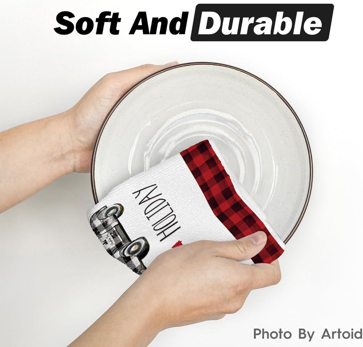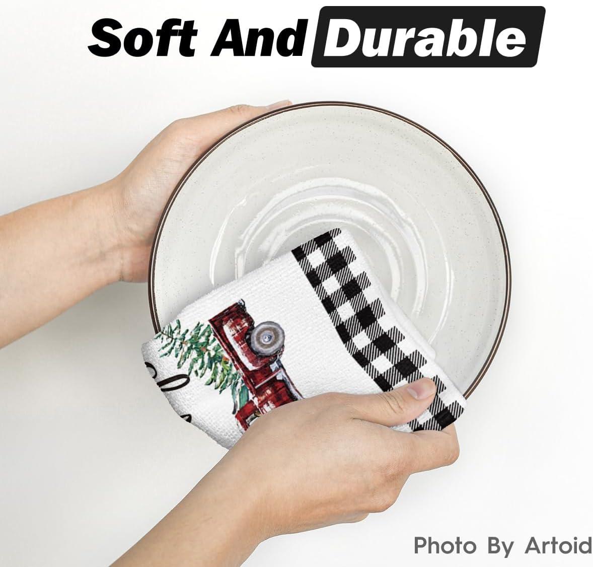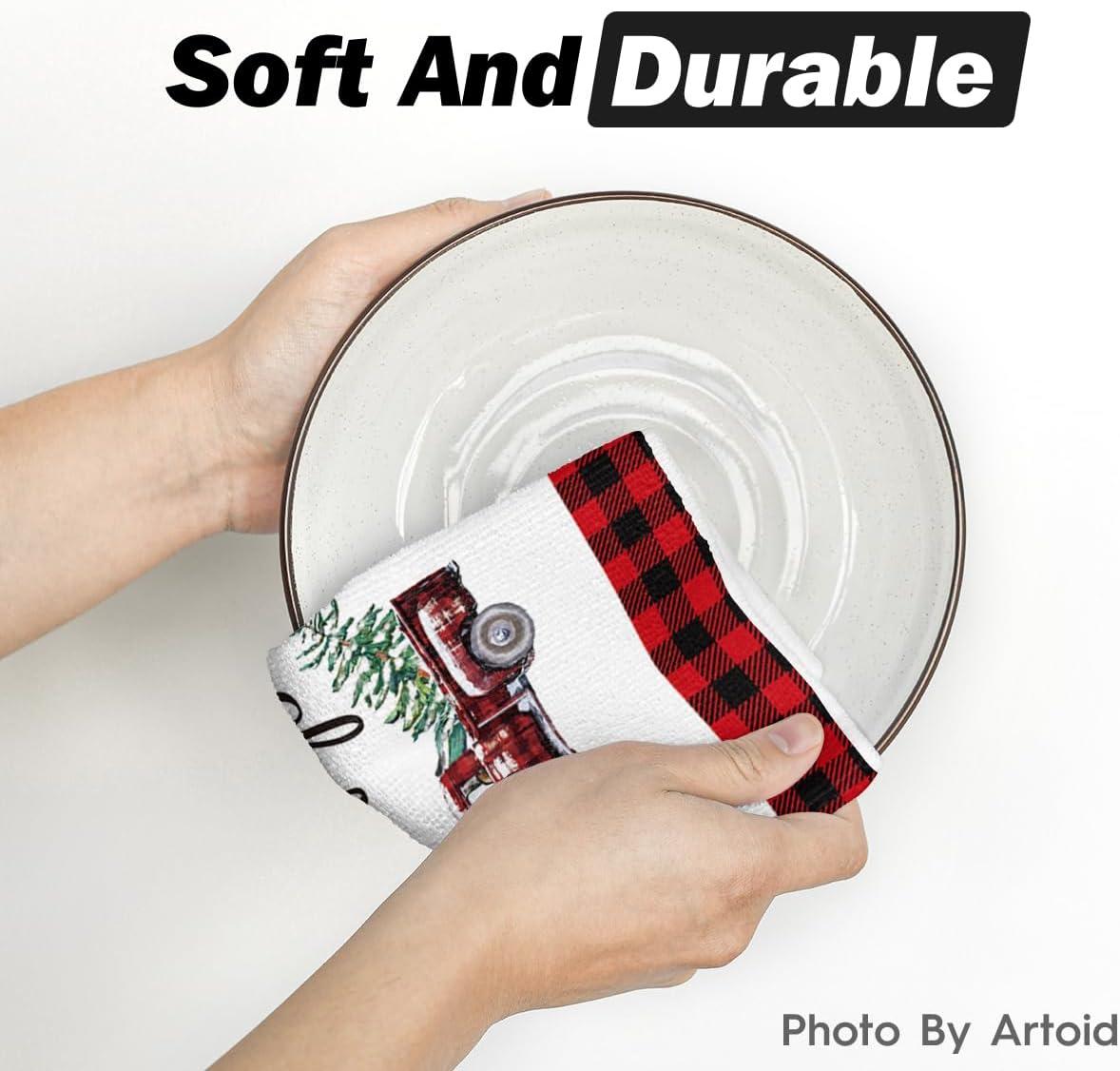 Artoid Mode Black White Truck Christmas Trees Kitchen Dish Towels, 18 x 26 Inch Winter Buffalo Plaid Holiday Ultra Absorbent Drying Cloth Tea Towels Set of 2(Red/Black)