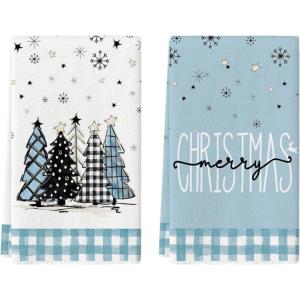 Artoid Mode Black Red Merry Christmas Kitchen Towels Dish Towels, 18×26 Inch Buffalo Plaid Winter Xmas Trees Star Decoration Hand Towels Set of 2(Blue/Beige)
