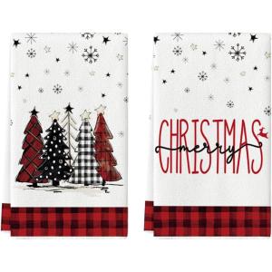 Artoid Mode Black Red Merry Christmas Kitchen Towels Dish Towels, 18×26 Inch Buffalo Plaid Winter Xmas Trees Star Decoration Hand Towels Set of 2(Red/Black)