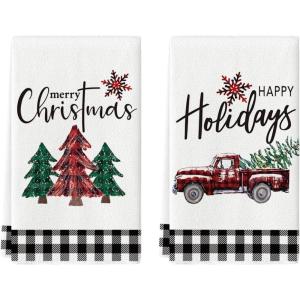 Artoid Mode Buffalo Plaid Truck Trees Kitchen Dish Towels Merry Christmas, 18 x 26 Inch Winter Drying Cloth Tea Towels for Cooking Baking Set of 2(Black/Beige)