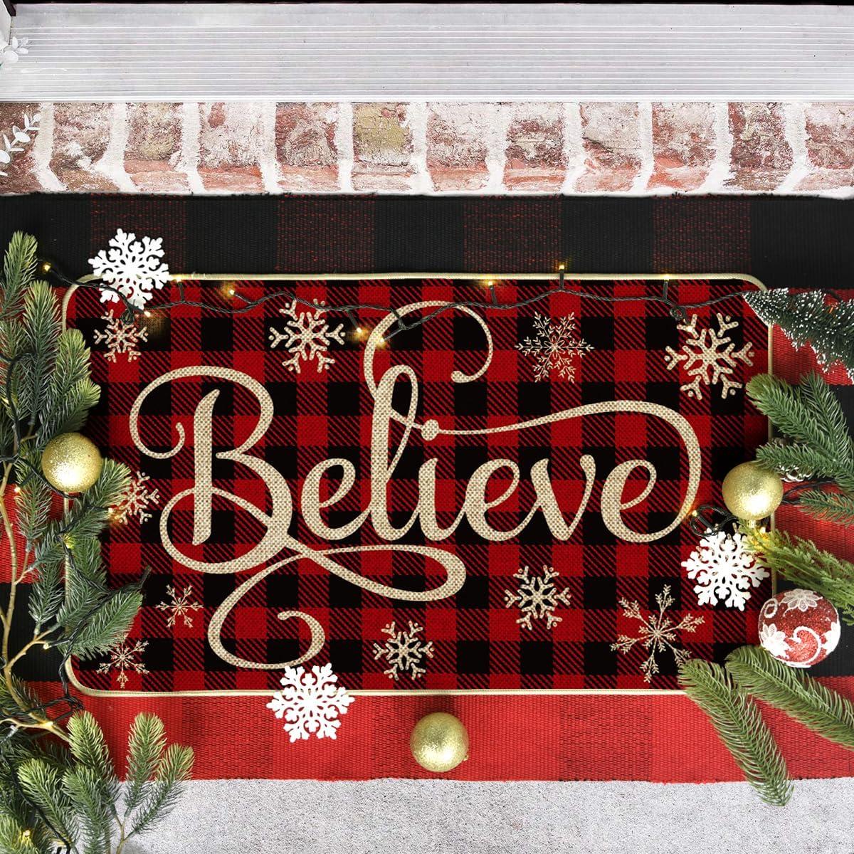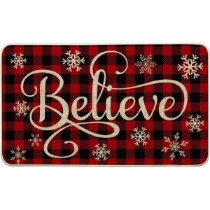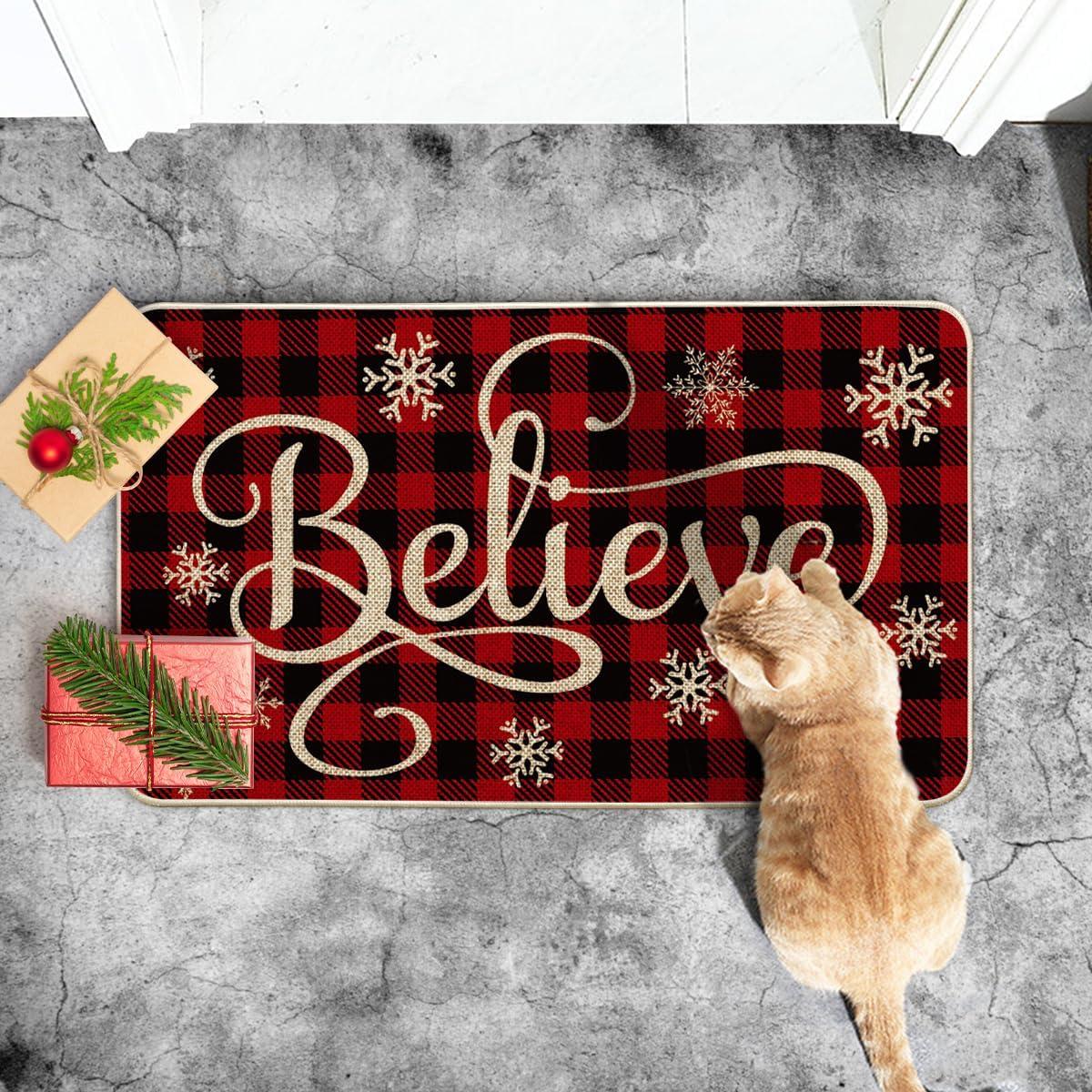 Artoid Mode Buffalo Plaid Snowflake Believe Decorative Doormat, Seasonal Winter Christmas Holiday Low-Profile Floor Mat Switch Mat for Indoor Outdoor 17 x 29 Inch
