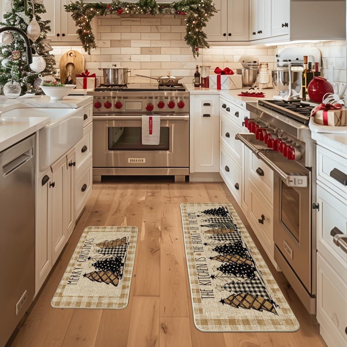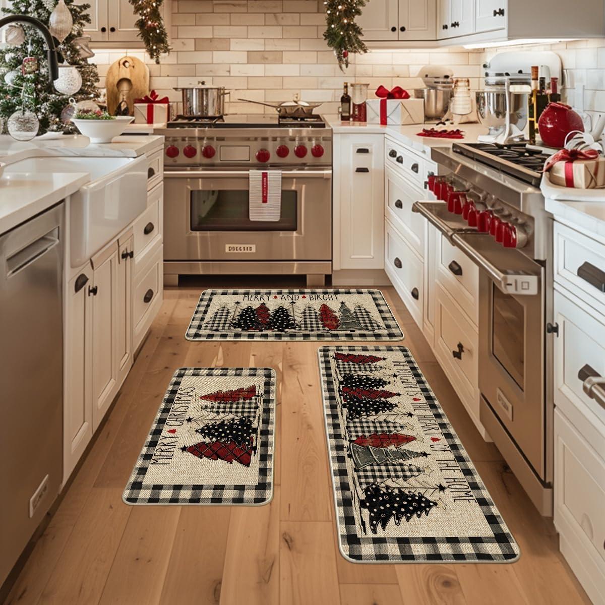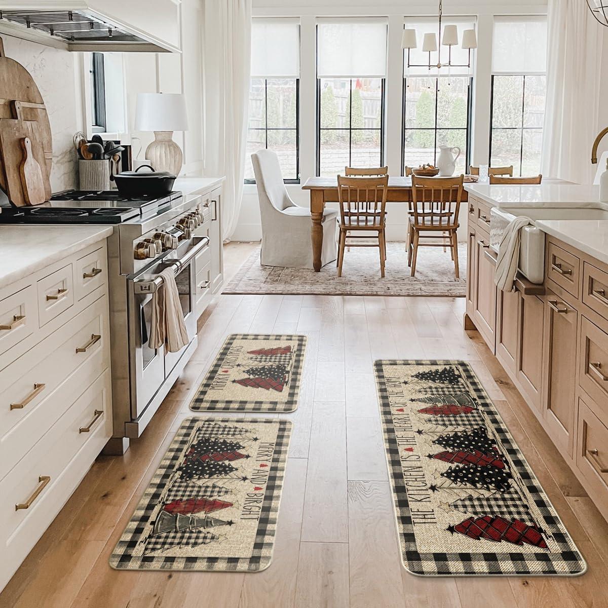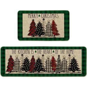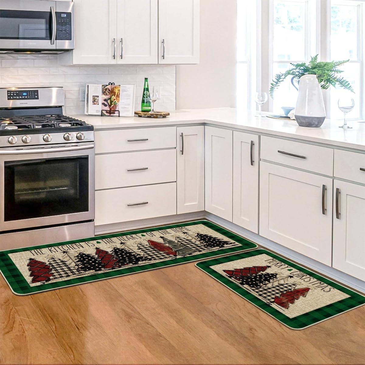Artoid Mode Green Buffalo Plaid Xmas Tree Merry Christmas Kitchen Mats Set of 2, Winter Home Decor Low-Profile Kitchen Rugs for Floor – 17×29 and 17×47 Inch(Black/Beige)
