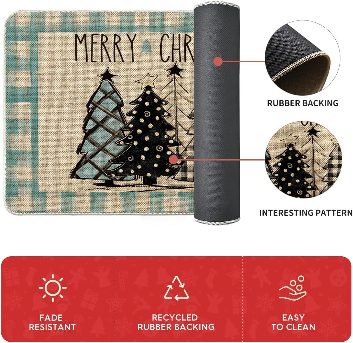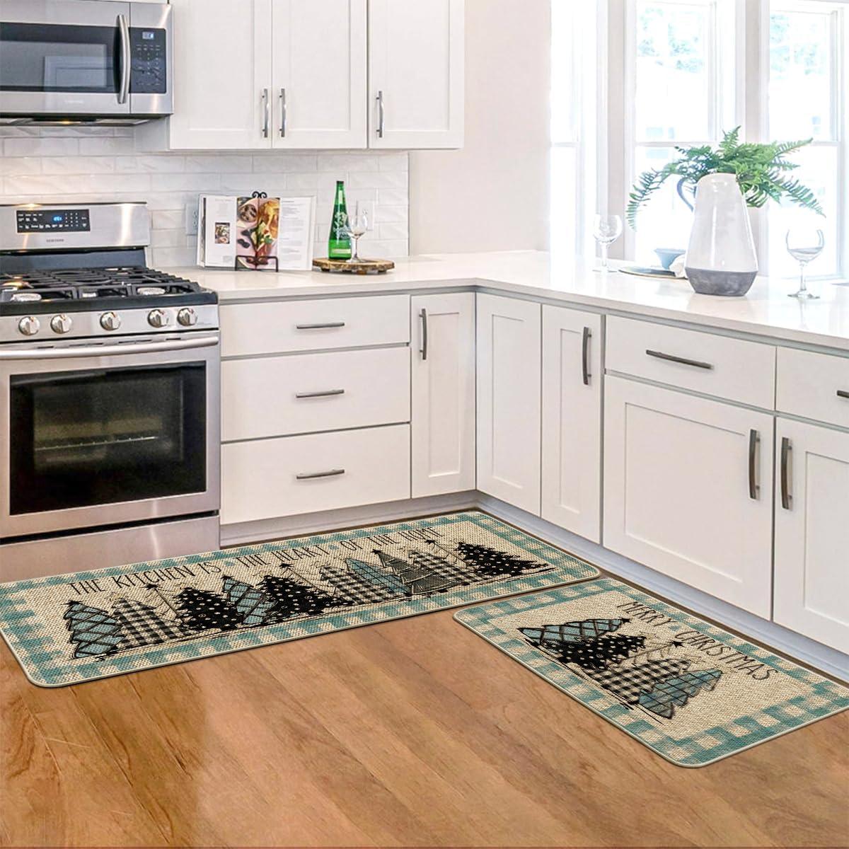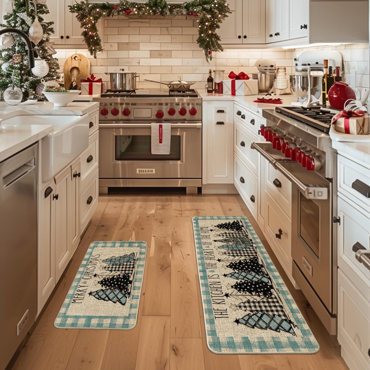 Artoid Mode Green Buffalo Plaid Xmas Tree Merry Christmas Kitchen Mats Set of 2, Winter Home Decor Low-Profile Kitchen Rugs for Floor – 17×29 and 17×47 Inch(Blue/Beige)