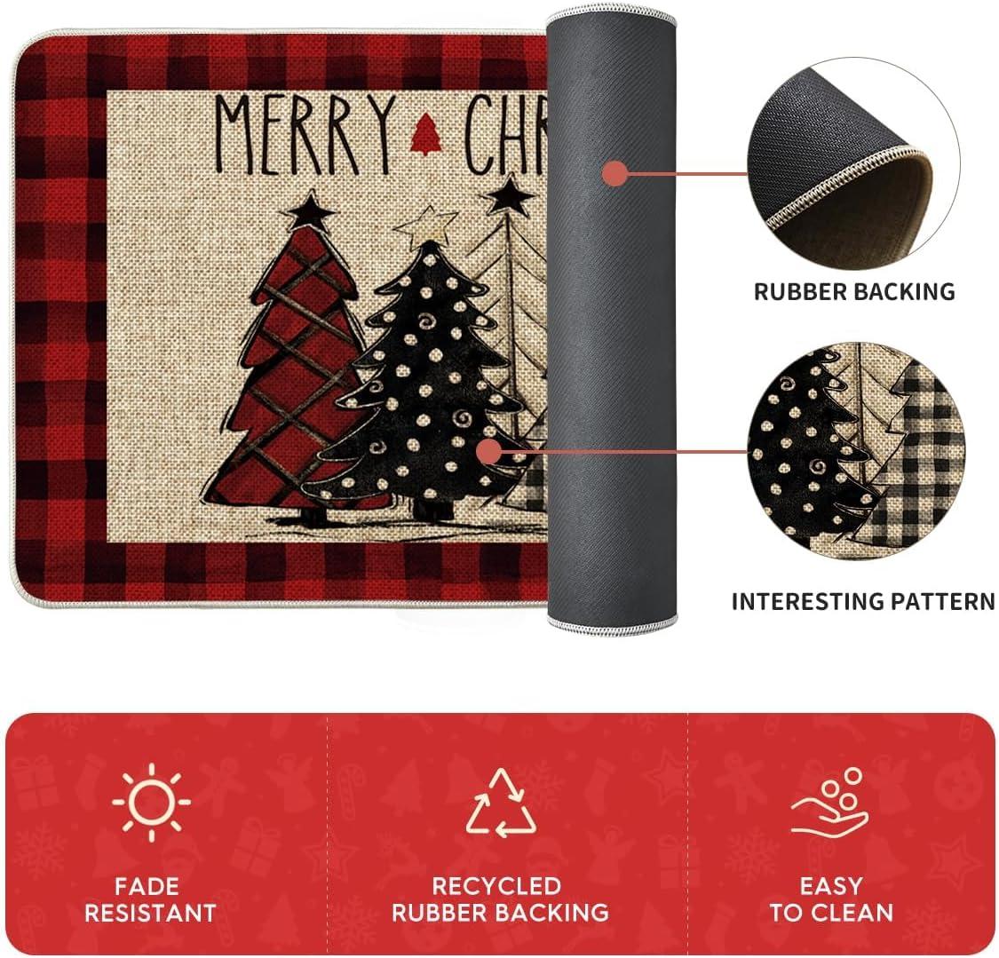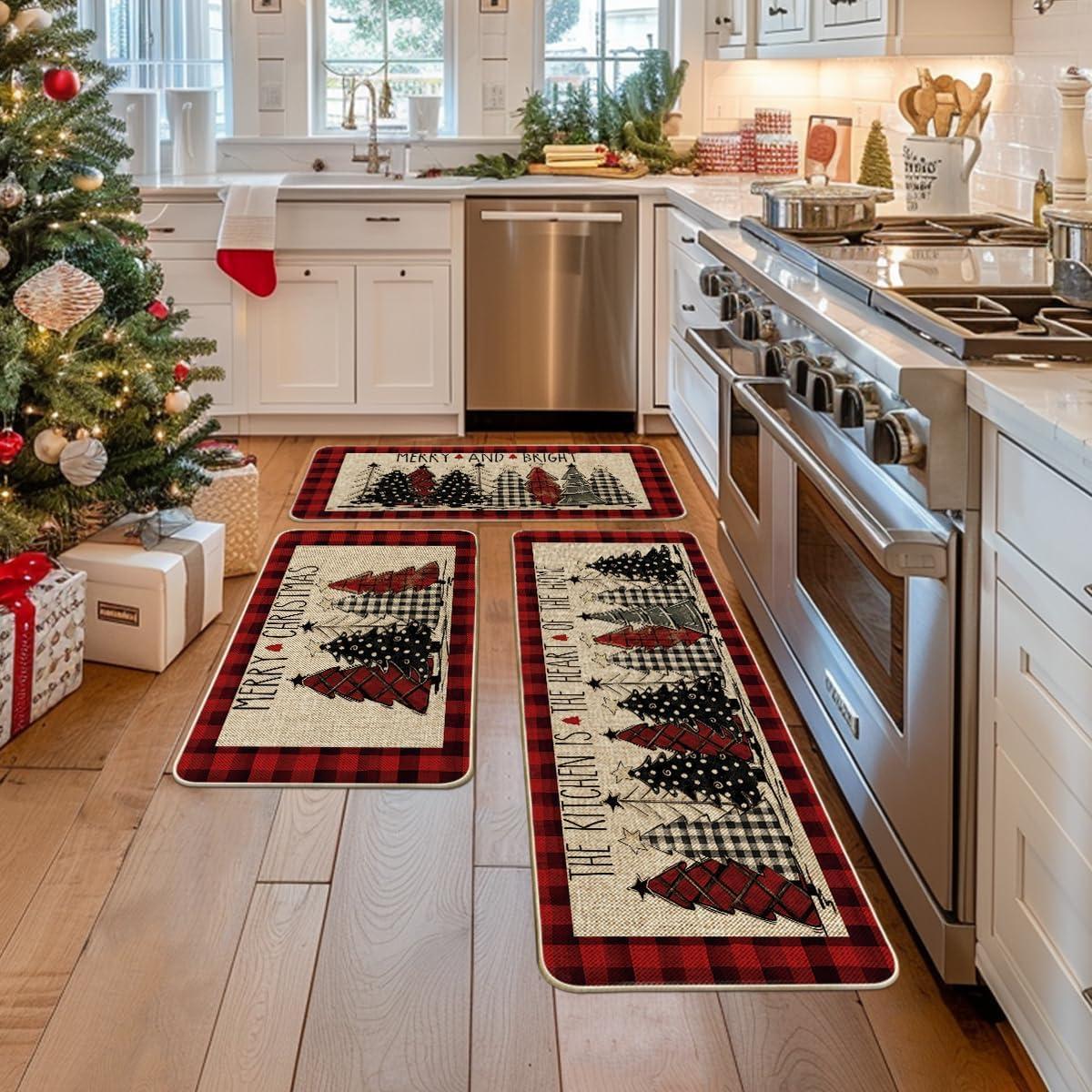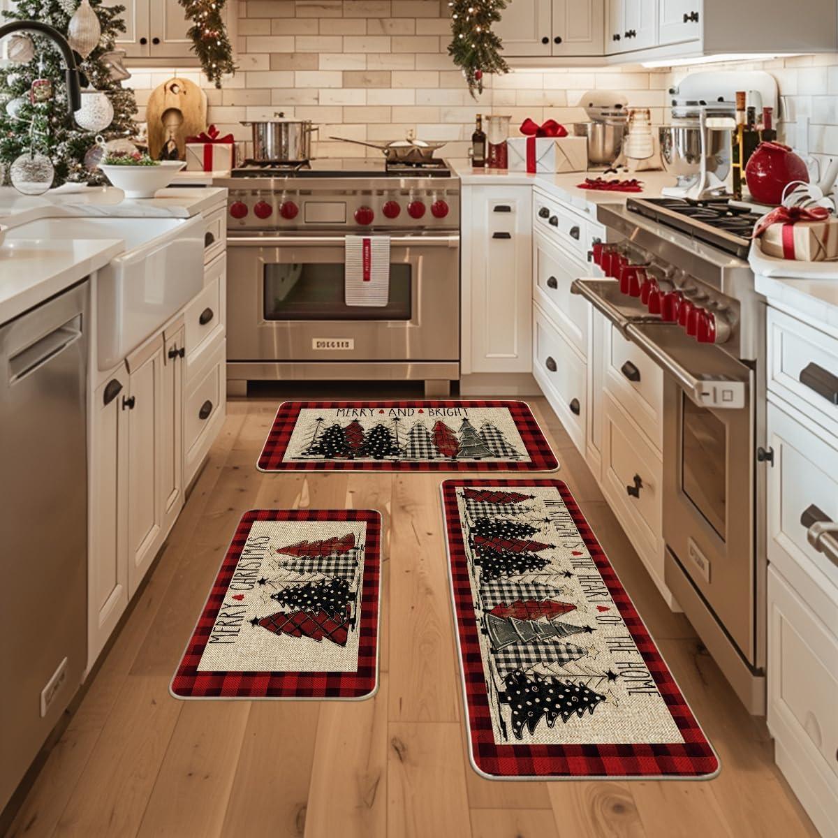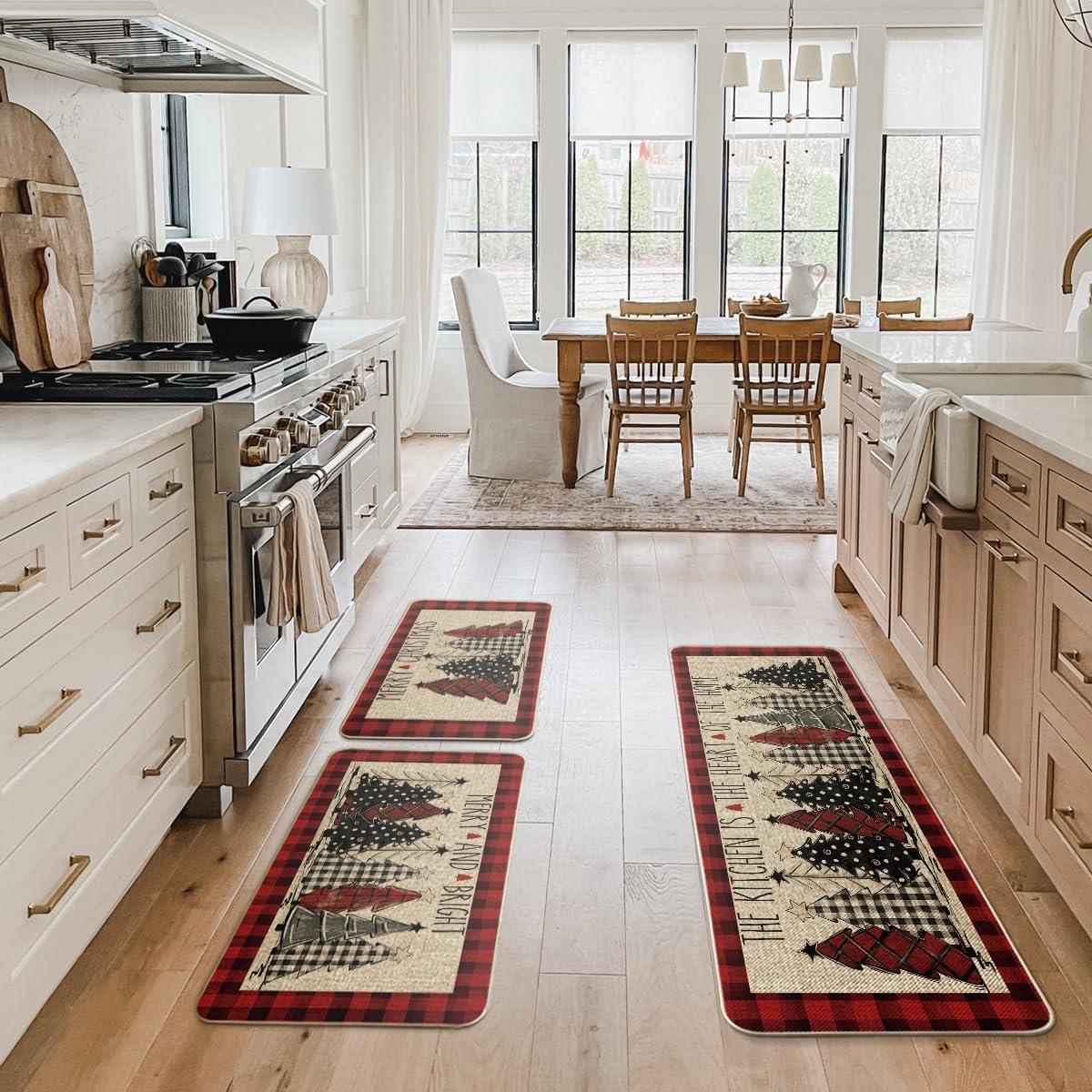 Artoid Mode Green Buffalo Plaid Xmas Tree Merry Christmas Kitchen Mats Set of 2, Winter Home Decor Low-Profile Kitchen Rugs for Floor – 17×29 and 17×47 Inch(Red/Beige)