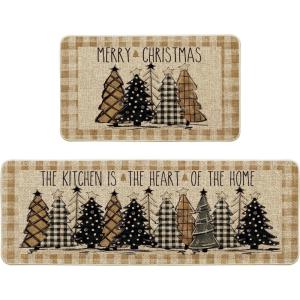 Artoid Mode Green Buffalo Plaid Xmas Tree Merry Christmas Kitchen Mats Set of 2, Winter Home Decor Low-Profile Kitchen Rugs for Floor – 17×29 and 17×47 Inch(Brown/Beige)