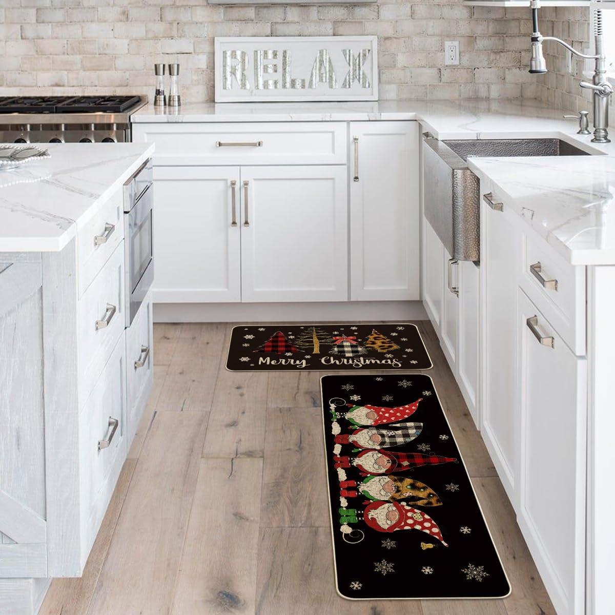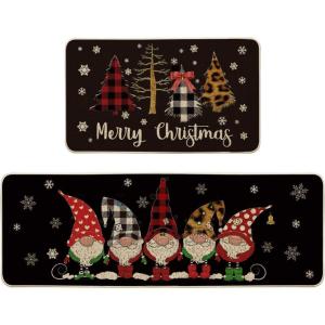 Artoid Mode Buffalo Plaid Tree Gnomes Black Christmas Kitchen Rugs Set of 2, Winter Low-Profile Floor Mat Merry Home Decora for Floor – 17×29 and 17×47 Inch