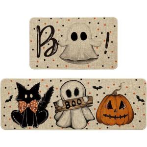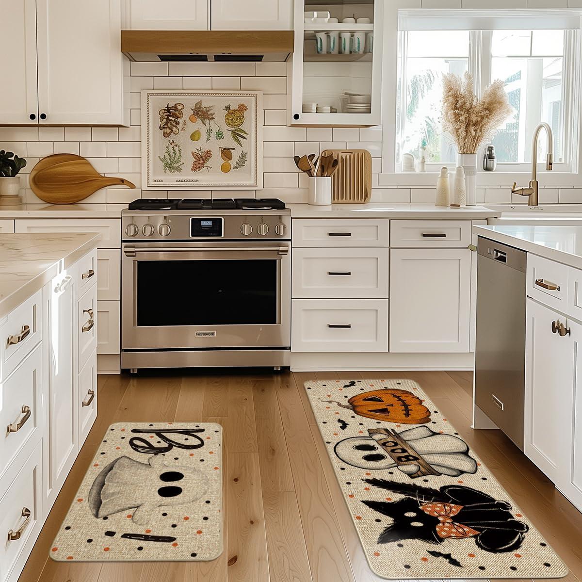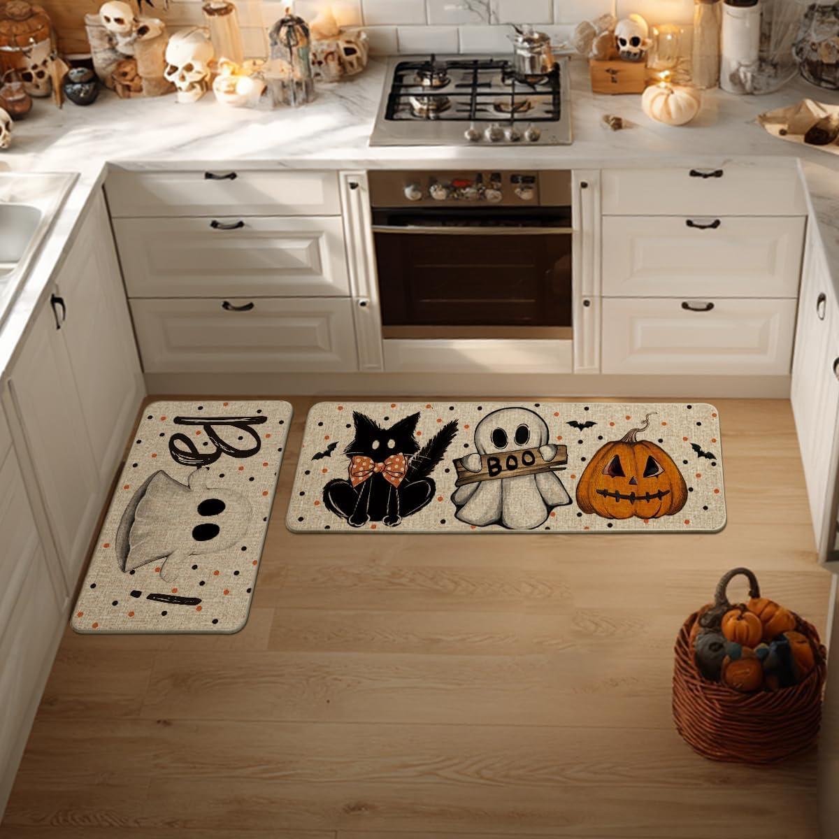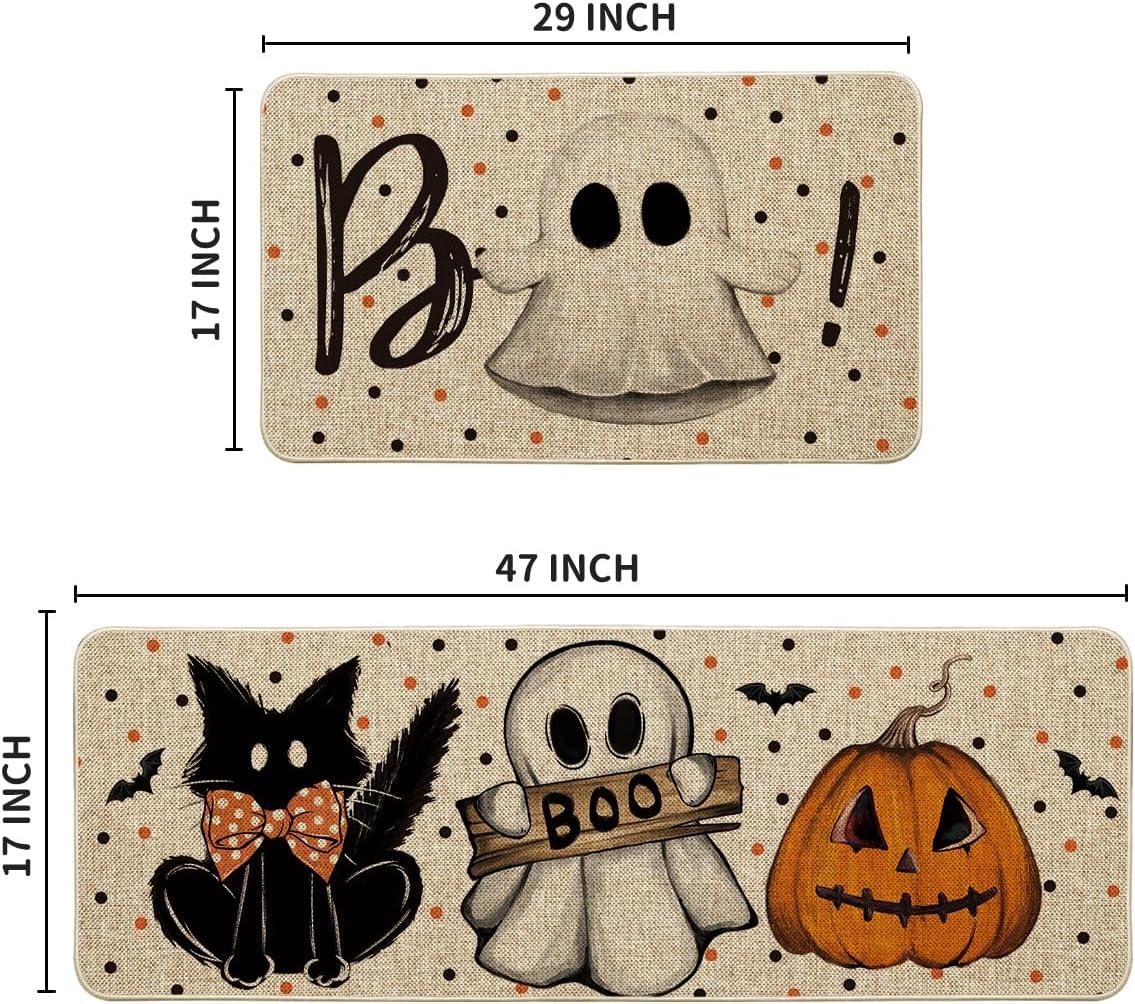 Artoid Mode Bats Black Cats Boo Pumpkin Halloween Kitchen Mats Set of 2, Home Decor Low-Profile Kitchen Rugs for Floor – 17×29 and 17×47 Inch(Beige)