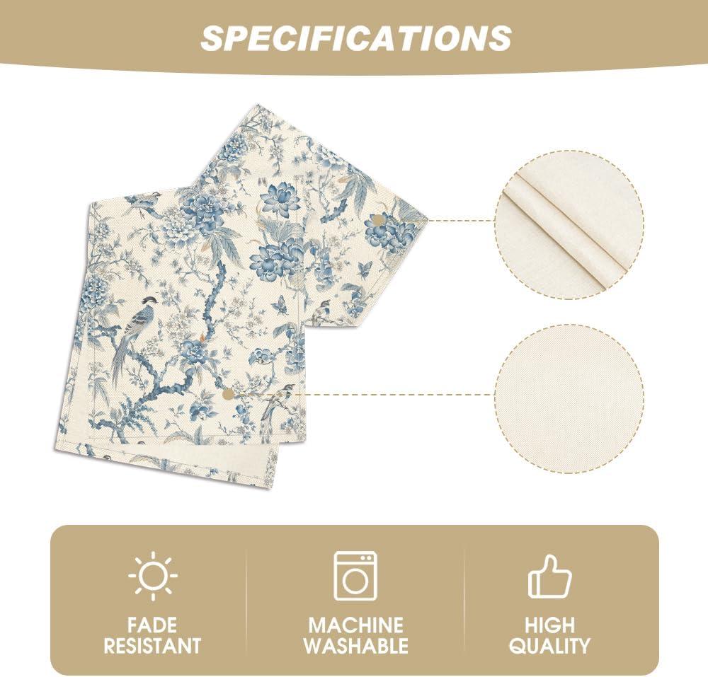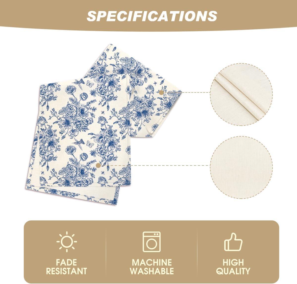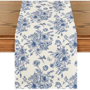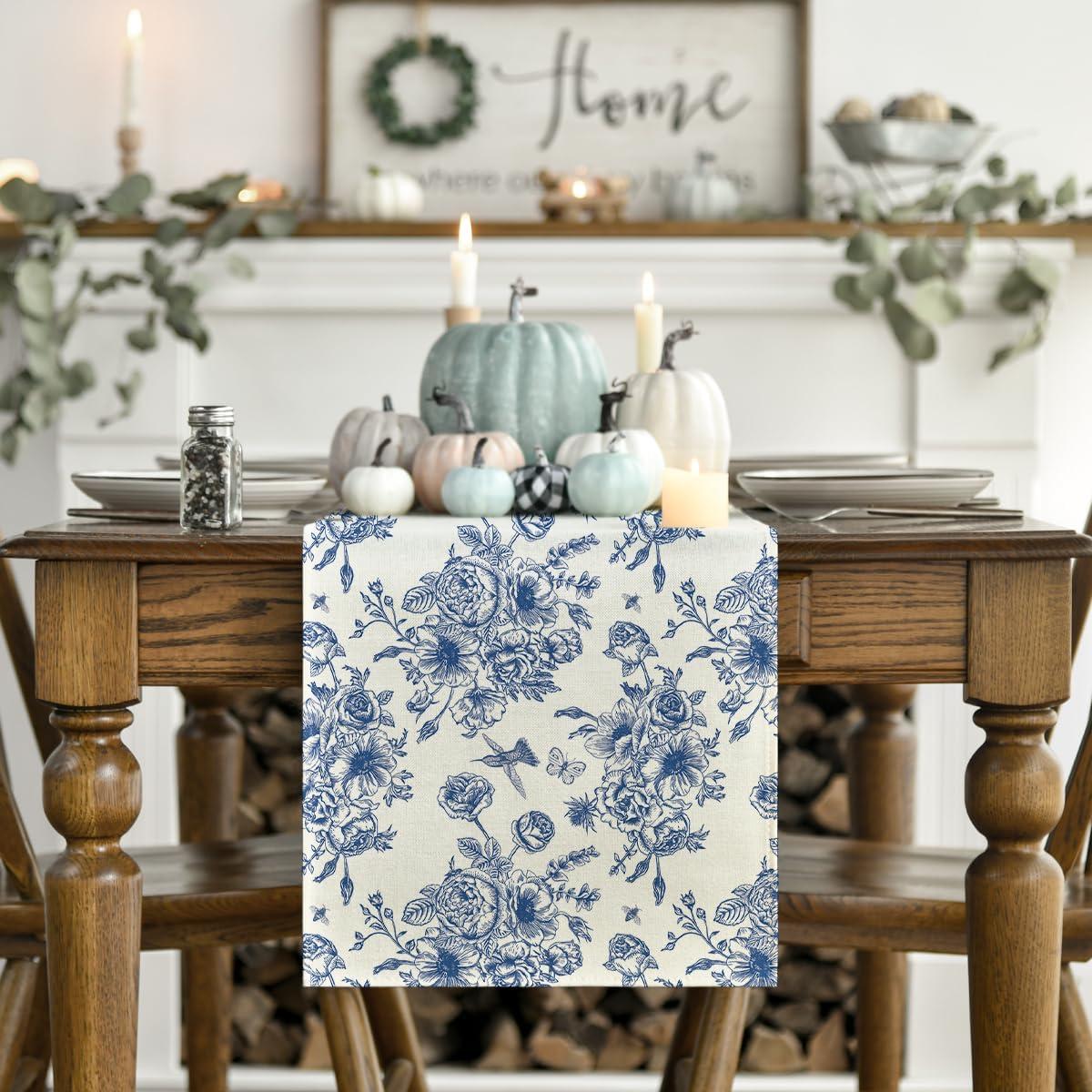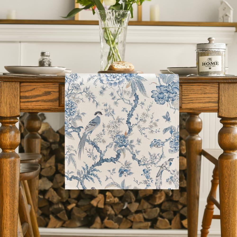 Artoid Mode Spring Navy Blue Floral Chinoiserie Table Runner, Seasonal Summer Kitchen Dining Table Decoration for Home Party Decor 13×72 Inch(Blue/Beige)