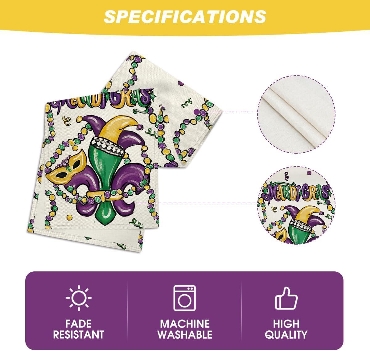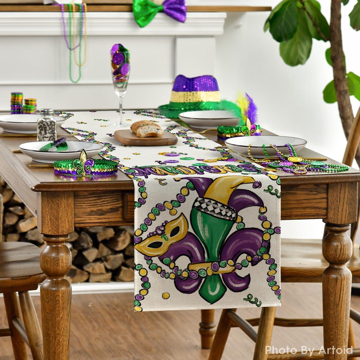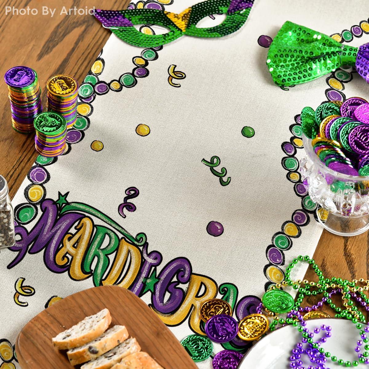 Artoid Mode Beads Happy Mardi Gras Carnival Table Runner, Seasonal Holiday Kitchen Dining Table Decoration for Indoor Outdoor Home Party Decor 13 x 72 Inch(Purple)