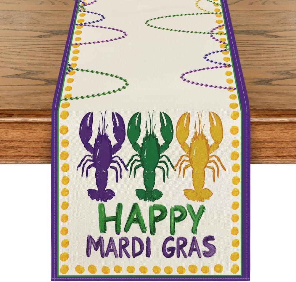Artoid Mode Prawns Stripes Happy Mardi Gras Table Runner, Seasonal Carnival Holiday Kitchen Dining Table Decoration for Indoor Outdoor Home Party Decor 13×72 Inch(Beige)