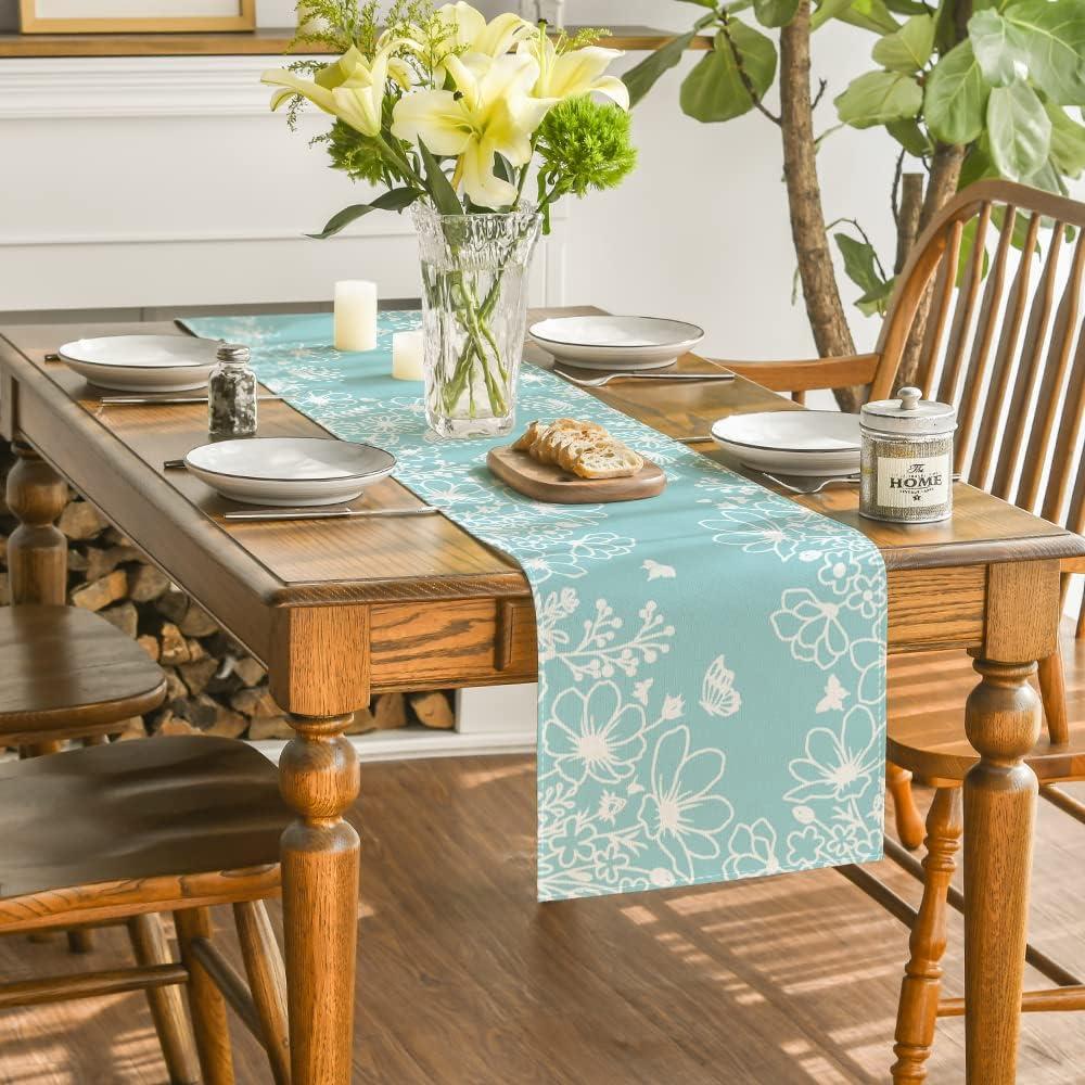 Artoid Mode Pink Bloom Flowers Butterfly Spring Table Runner, Seasonal Holiday Kitchen Dining Table Decoration for Home Party Indoor 13×72 Inch(Blue)