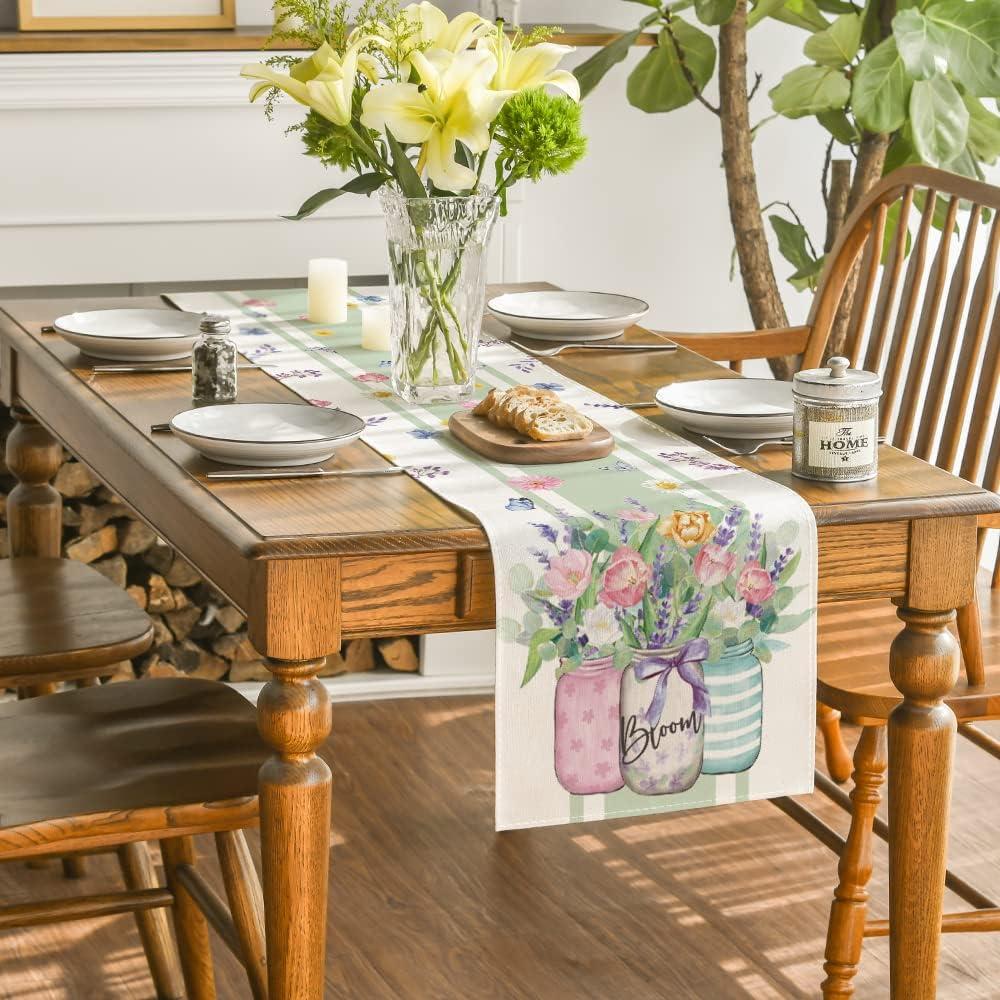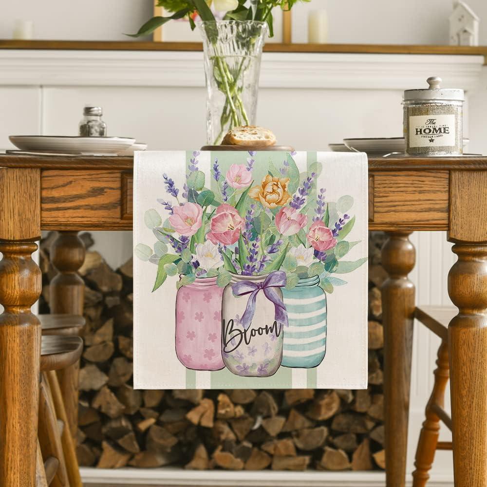 Artoid Mode Vase Bloom Tulip Lavender Summer Table Runner, Seasonal Spring Kitchen Dining Table Decoration for Home Party Decor 13×72 Inch(Green/White)