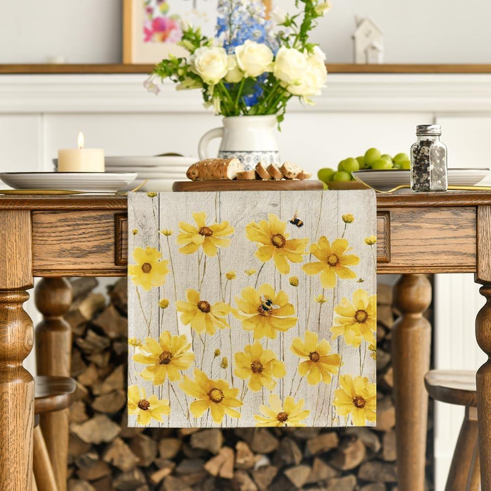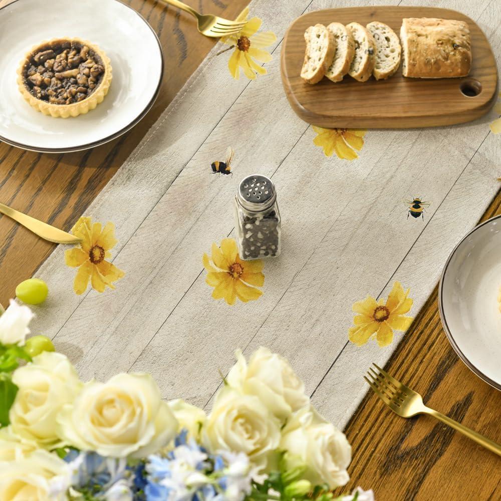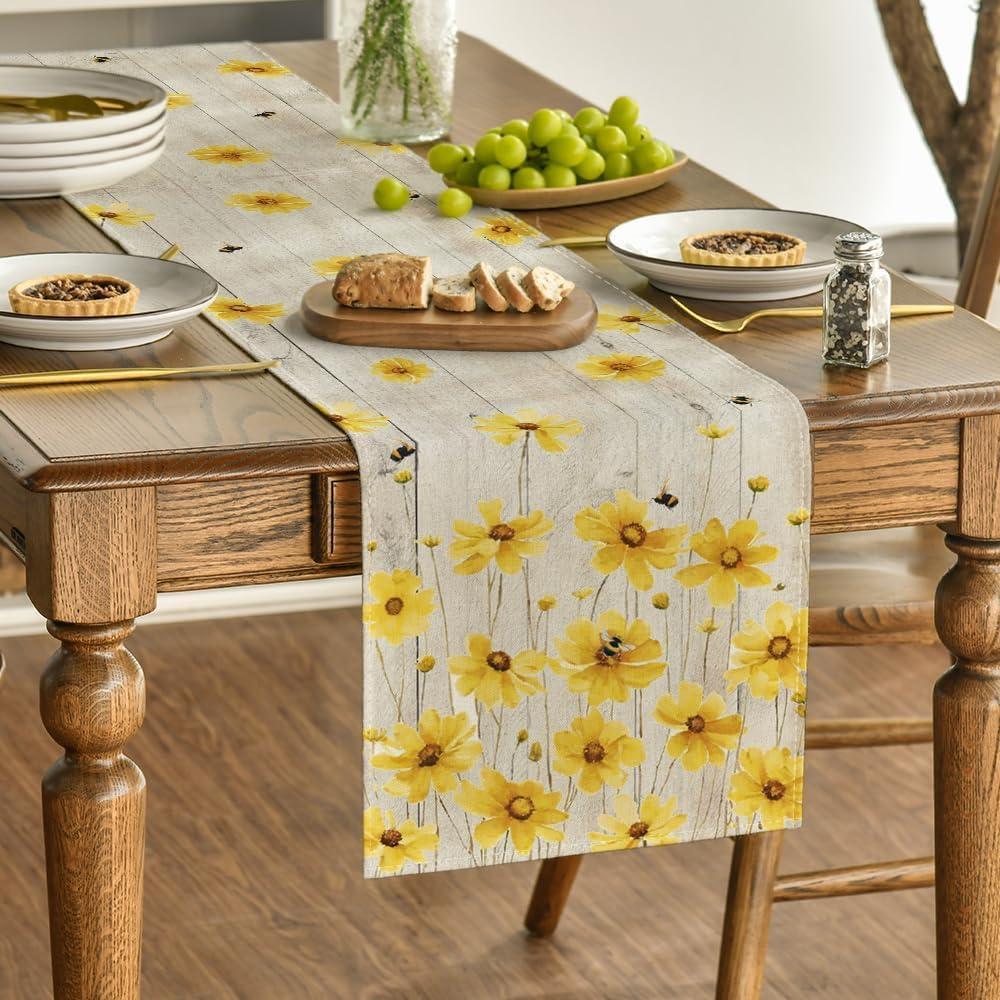 Artoid Mode Yellow Flowers Daisy Bees Summer Table Runner, Seasonal Easter Fall Holiday Kitchen Dining Table Decoration for Home Party Indoor 13×72 Inch(Wood)