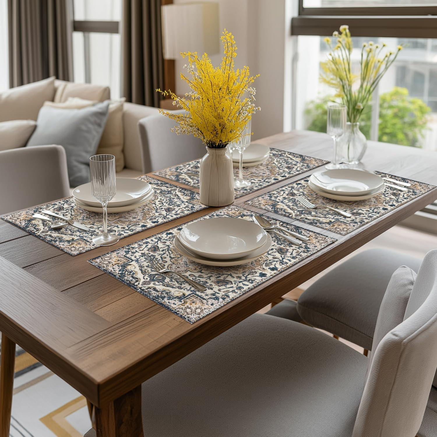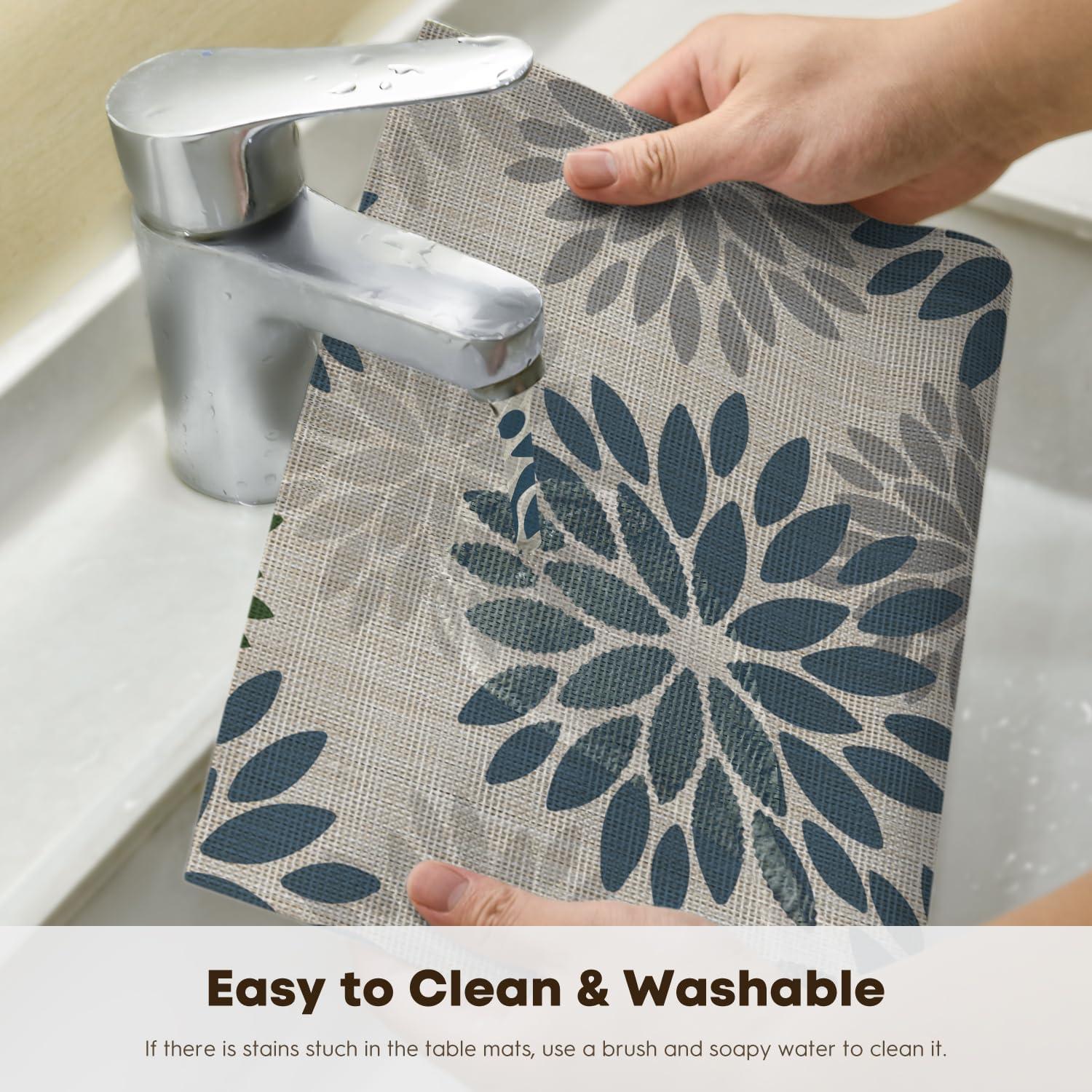 Artoid Mode Floral Vinyl Placemats Set of 4, 12×18 Inch Heat Resistant Washable Non-Slip Plistic PVC Place Mats for Party Kitchen Dining Decor, Pink Blue(Blue/Gray)