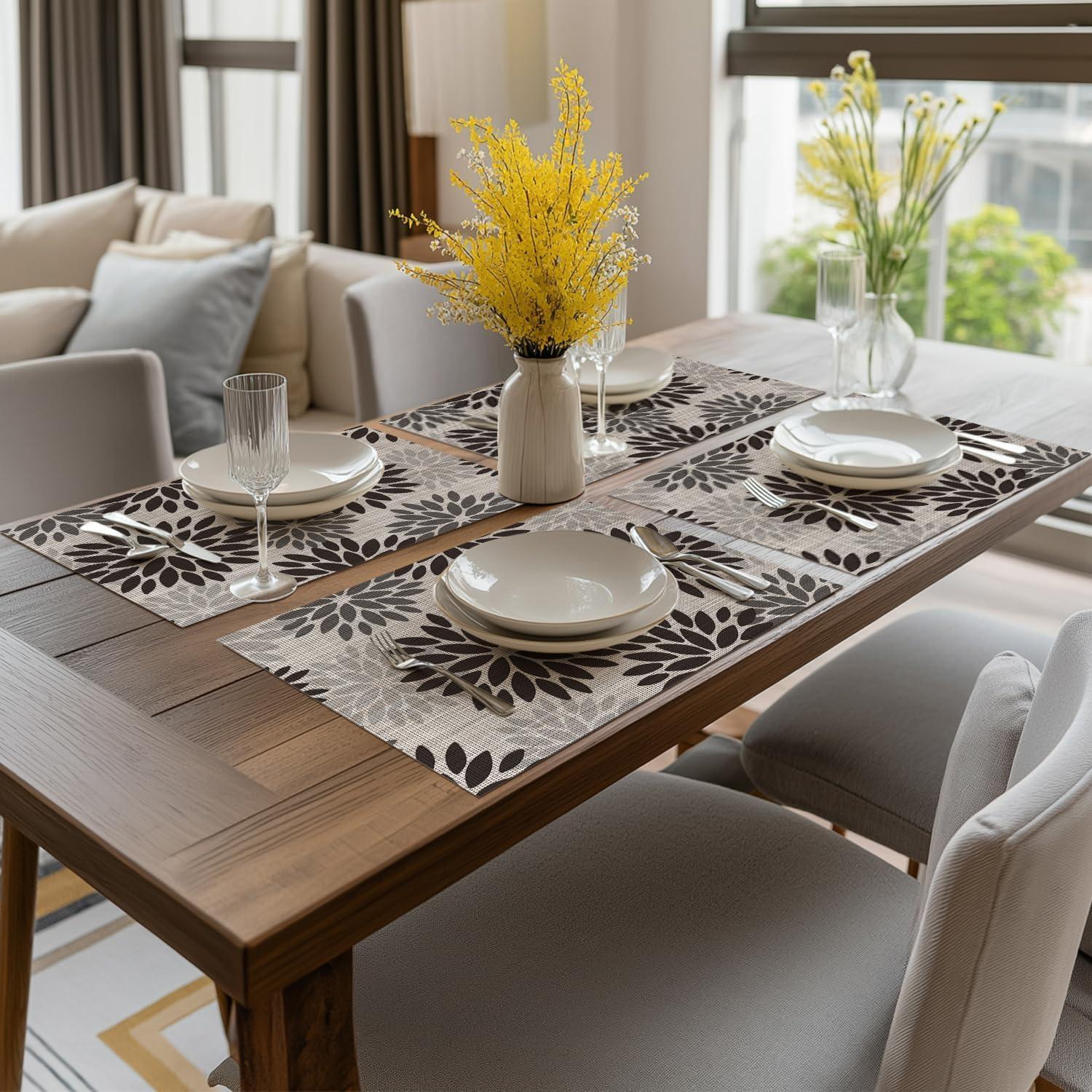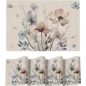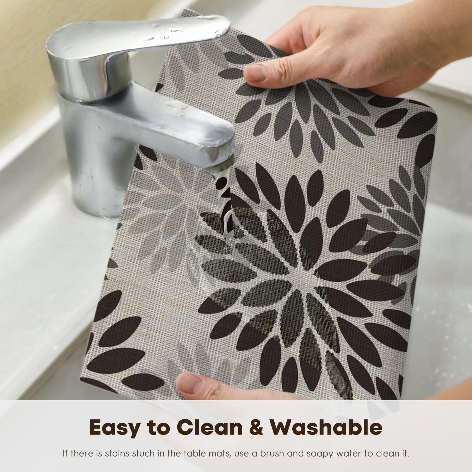 Artoid Mode Brown Poppy Floral Vinyl Plastic Placemats Set of 4, Washable Non-Slip PVC Table Mats for Party Kitchen Dining Decor, 12×18 Inch(Brown)
