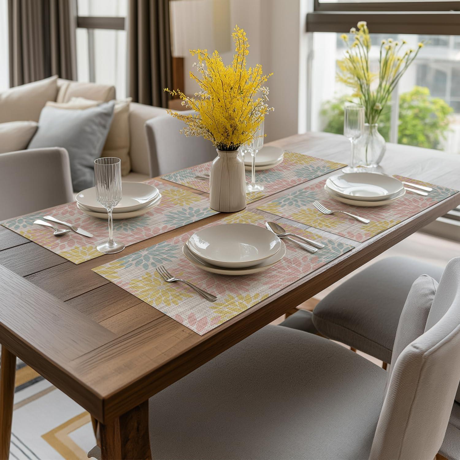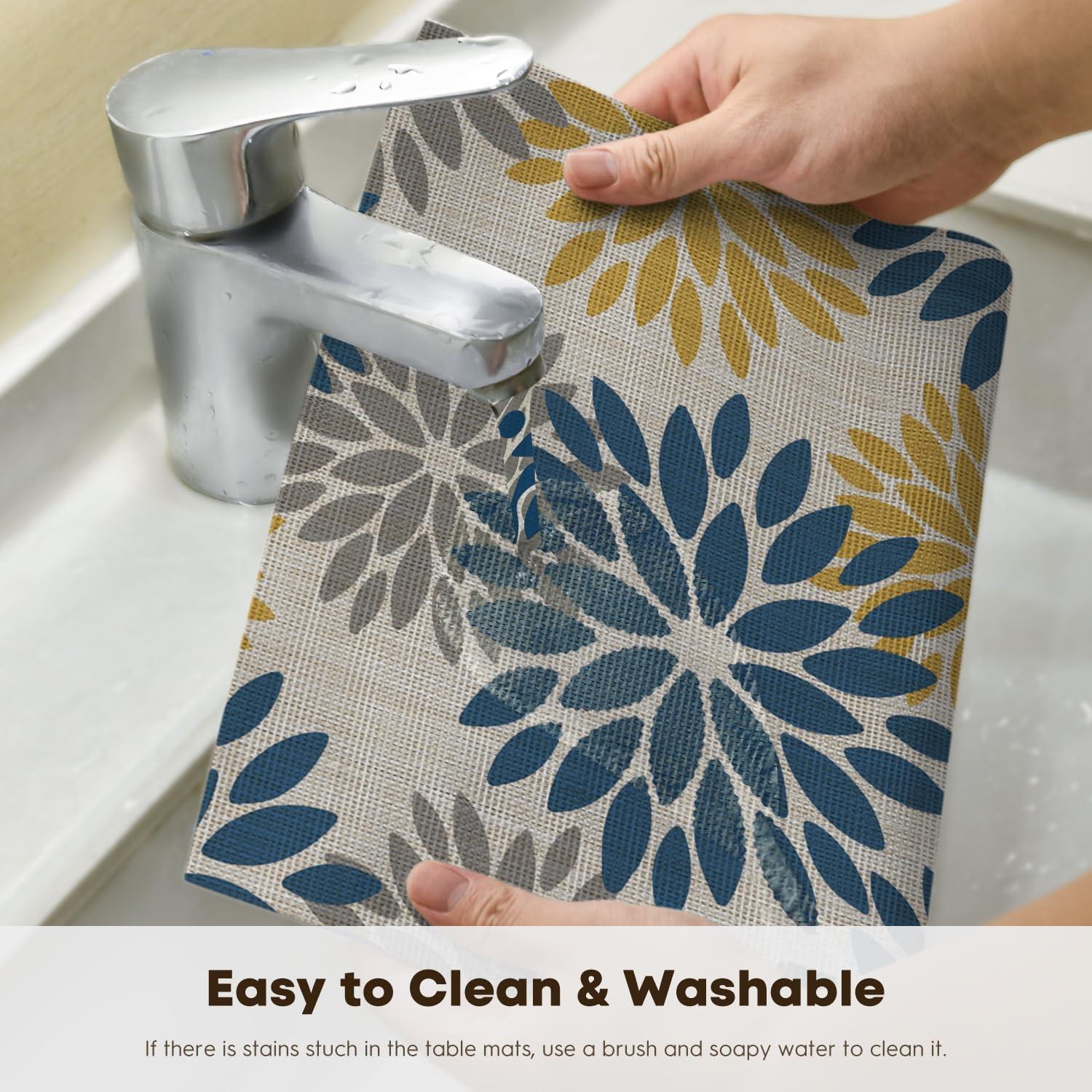 Artoid Mode Floral Vinyl Placemats Set of 4, 12×18 Inch Heat Resistant Washable Non-Slip Plistic PVC Place Mats for Party Kitchen Dining Decor, Pink Blue(Blue/Yellow)