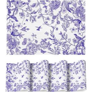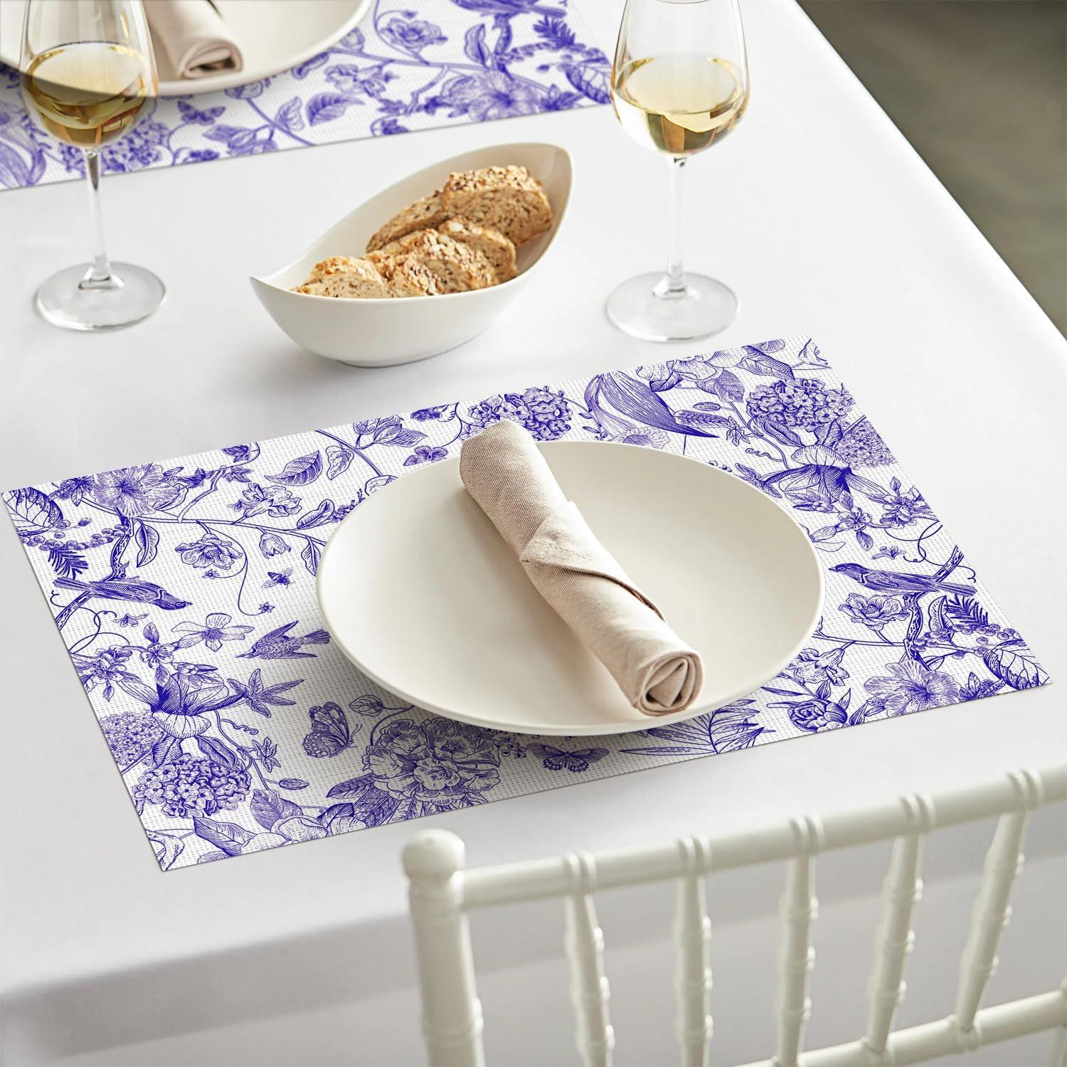 Artoid Mode Floral Vinyl Placemats Set of 4, 12×18 Inch Heat Resistant Washable Non-Slip Plistic PVC Place Mats for Party Kitchen Dining Decor, Pink Blue(Blue/Gray)