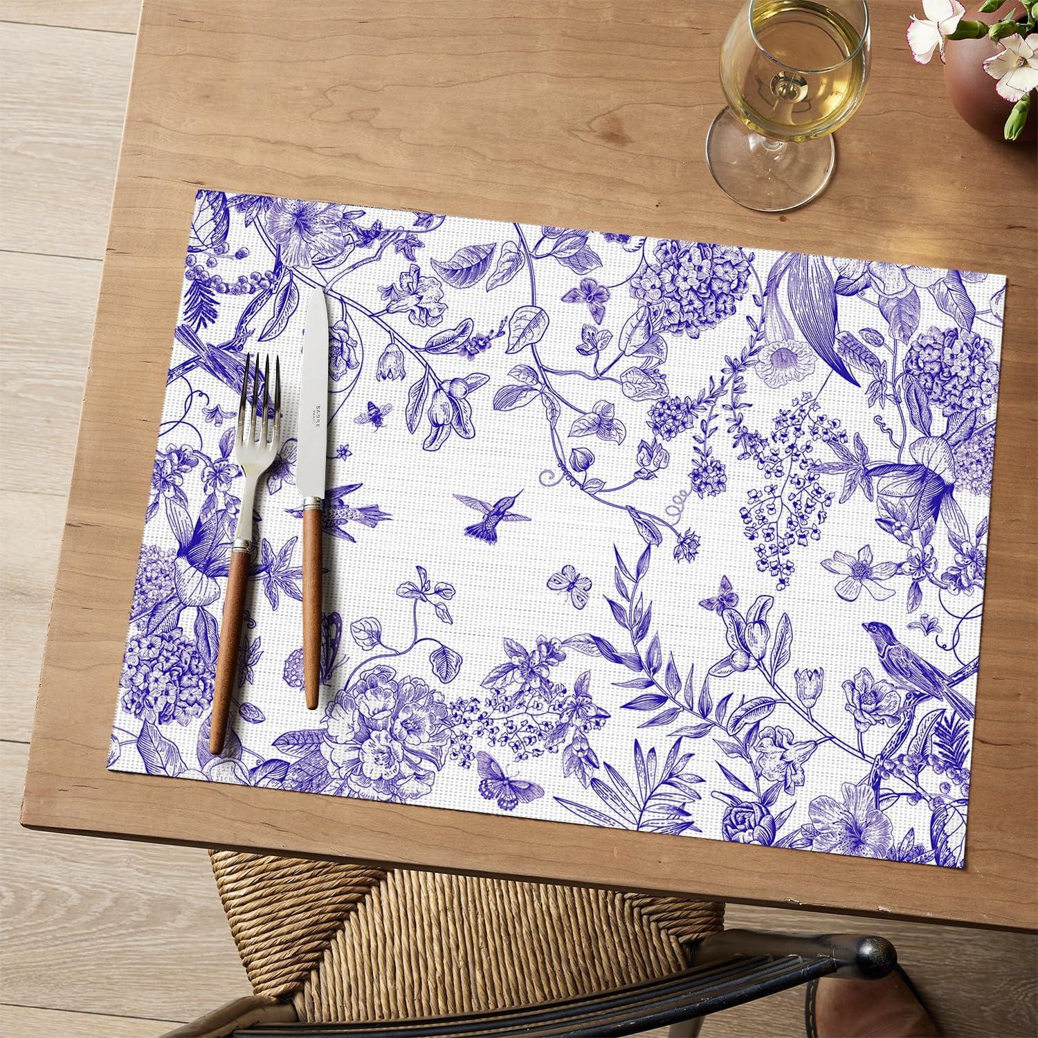 Artoid Mode Floral Vinyl Placemats Set of 4, 12×18 Inch Heat Resistant Washable Non-Slip Plistic PVC Place Mats for Party Kitchen Dining Decor, Pink Blue(Blue/Yellow)