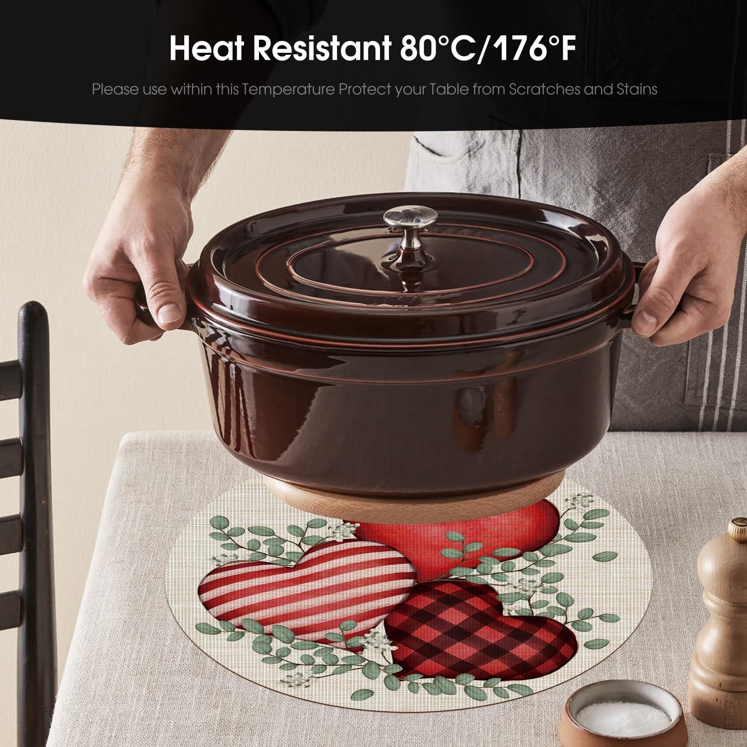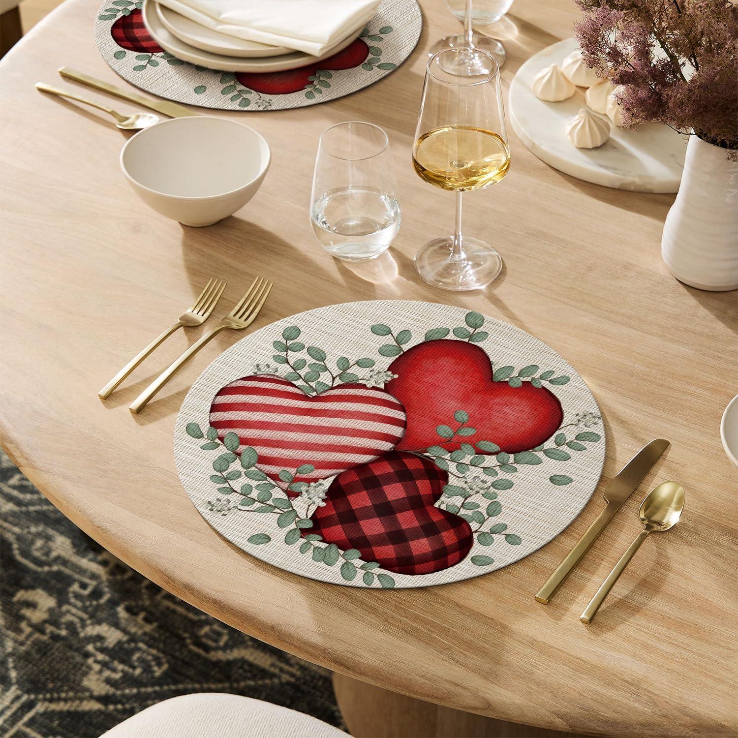 Artoid Mode Eucalyptus Hearts Vinyl Valentine’s Day Placemats Set of 4, 15 Inch Wipeable Non-Slip PVC Round Place Mats for Party Kitchen Dining Decor(Beige)