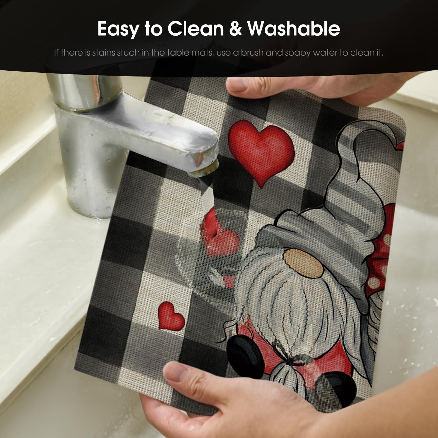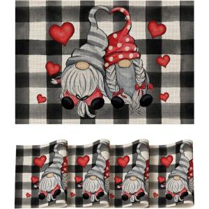 Artoid Mode Hearts Gnomes Vinyl Valentine’s Day Placemats Set of 4, 12×18 Inch Wipeable Non-Slip PVC Place Mats for Party Kitchen Dining Decor(Black/Beige)