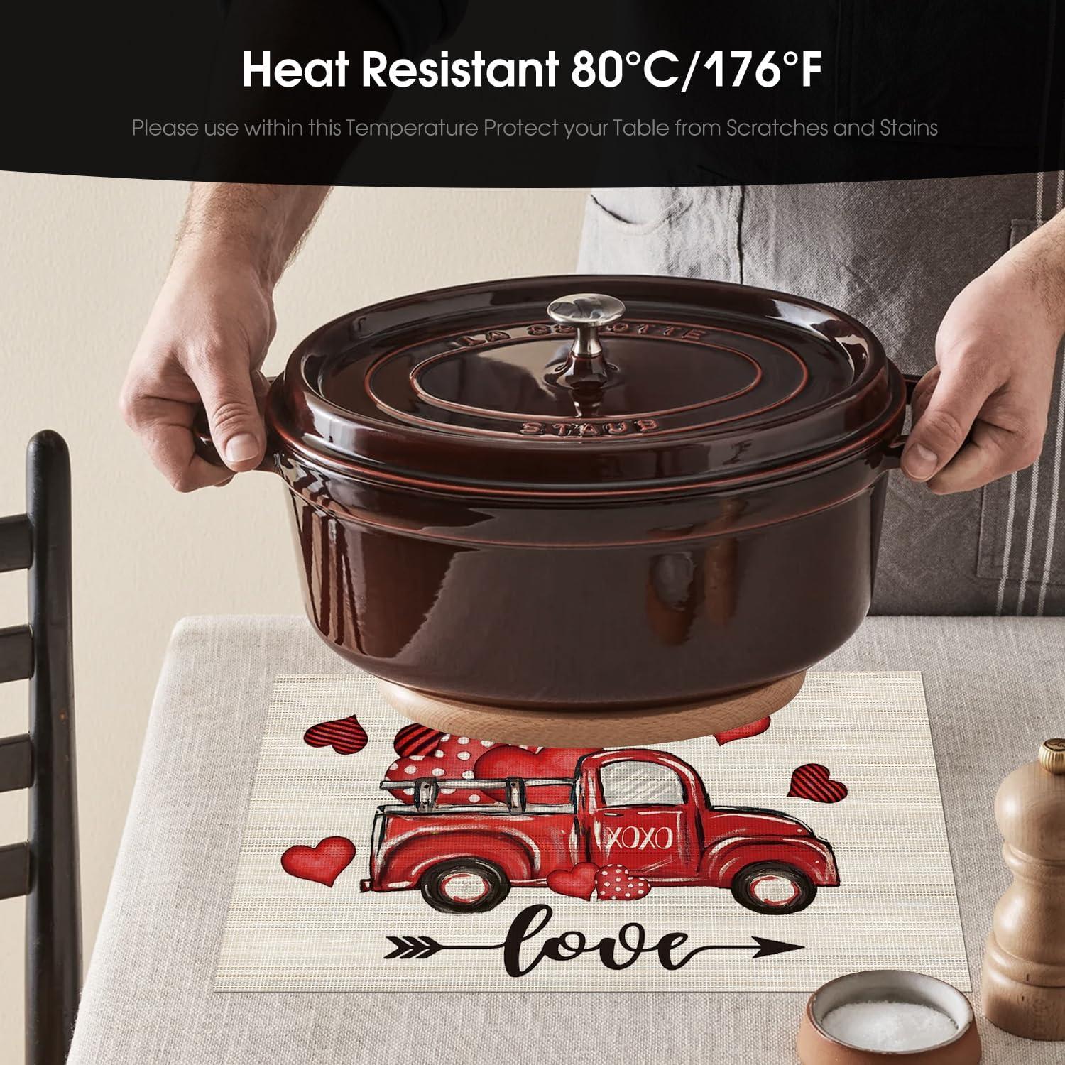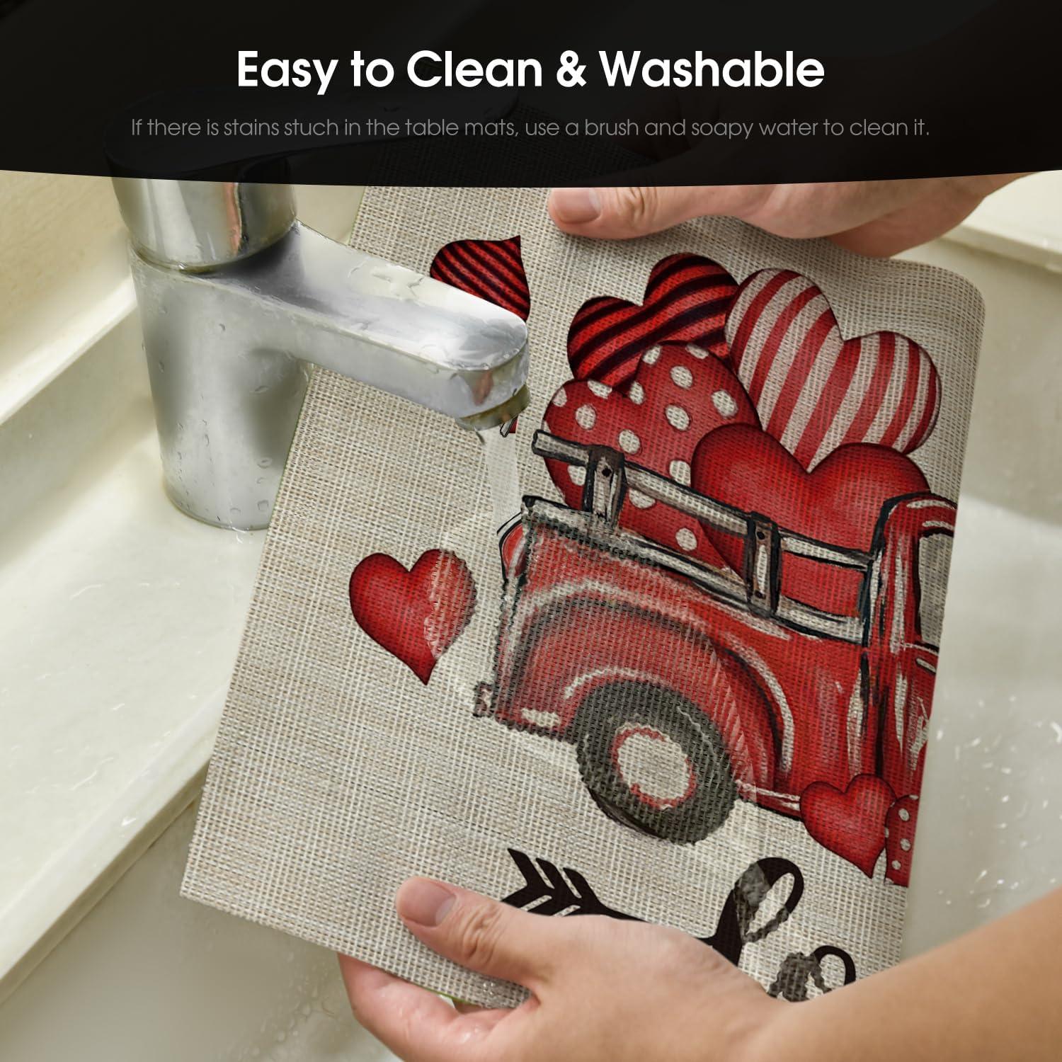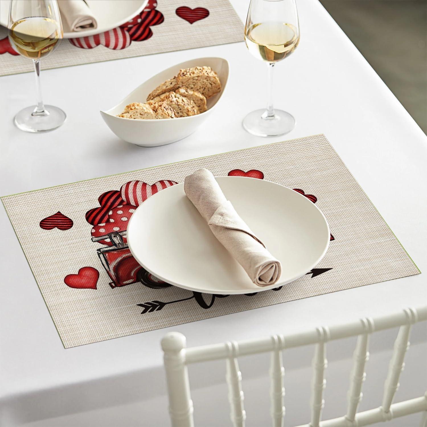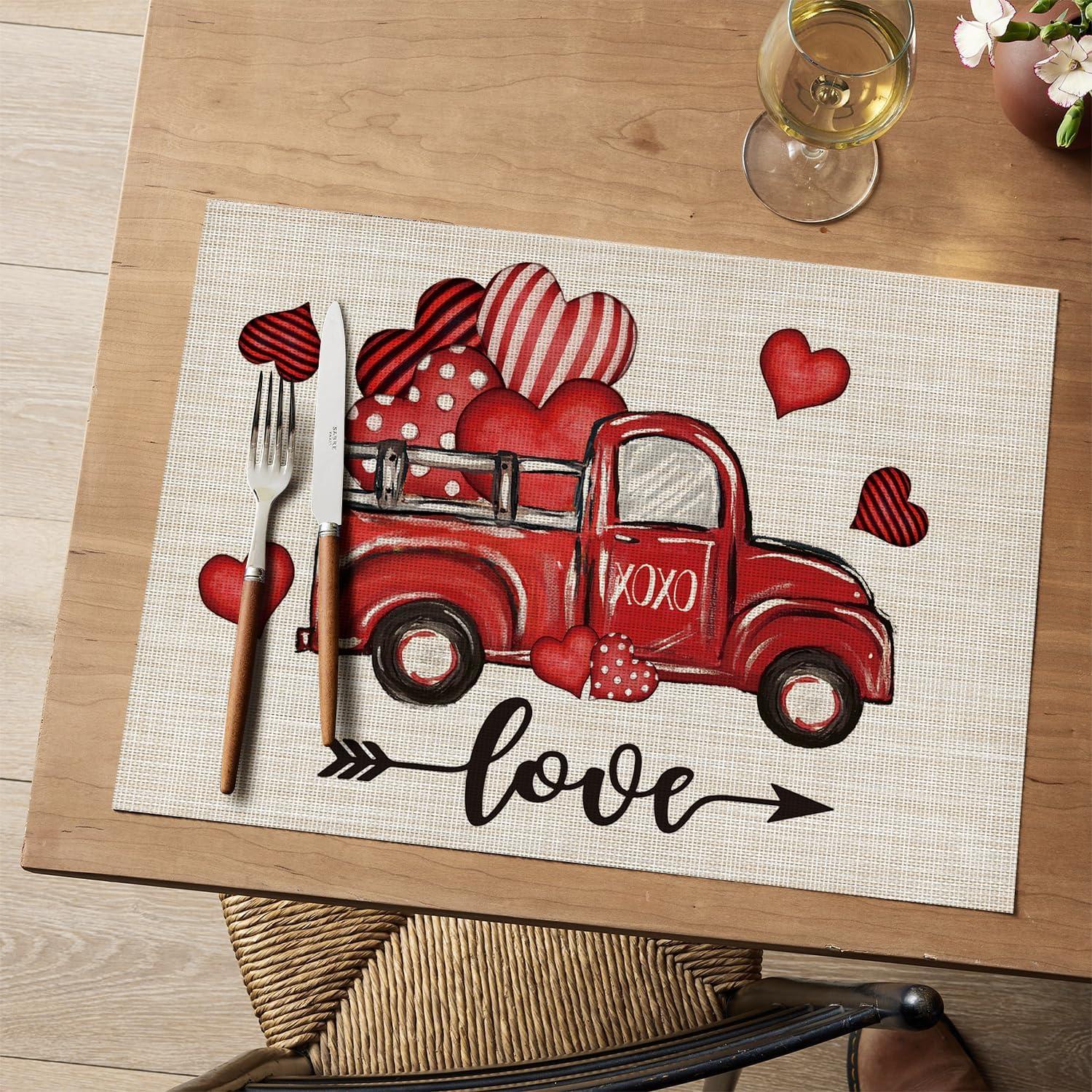 Artoid Mode Hearts Truck Vinyl Valentine’s Day Placemats Set of 4, 12×18 Inch Wipeable Non-Slip PVC Place Mats for Party Kitchen Dining Decor