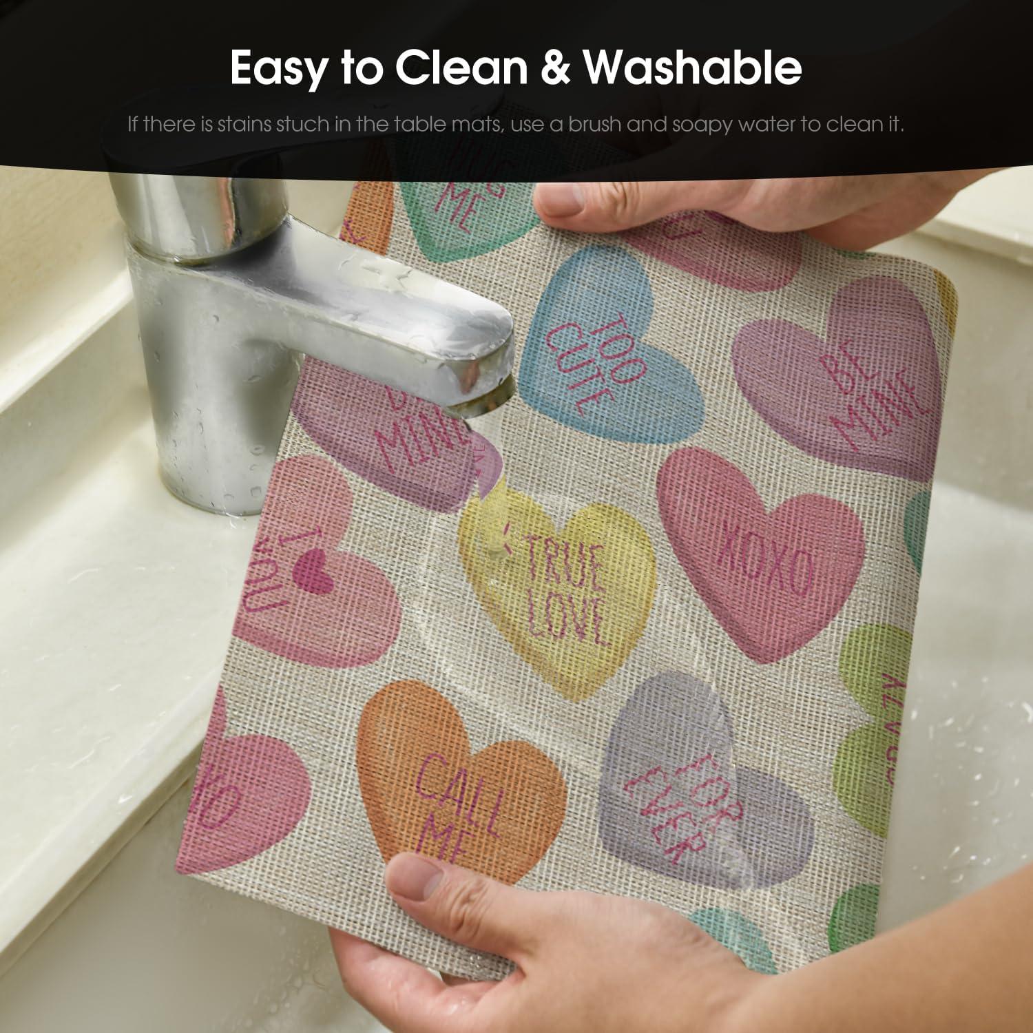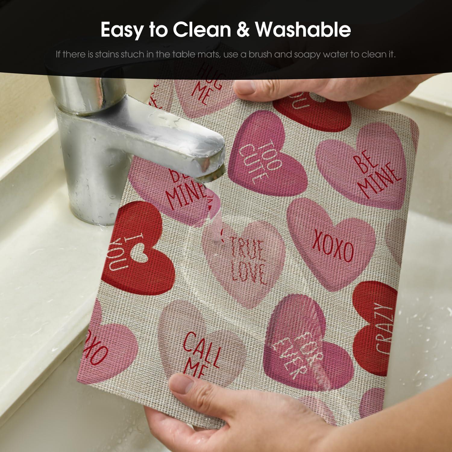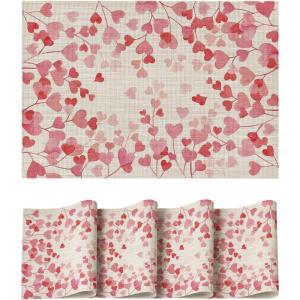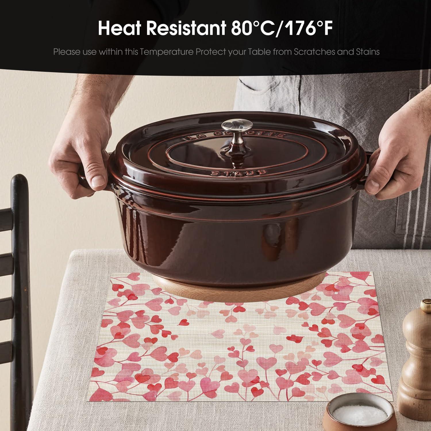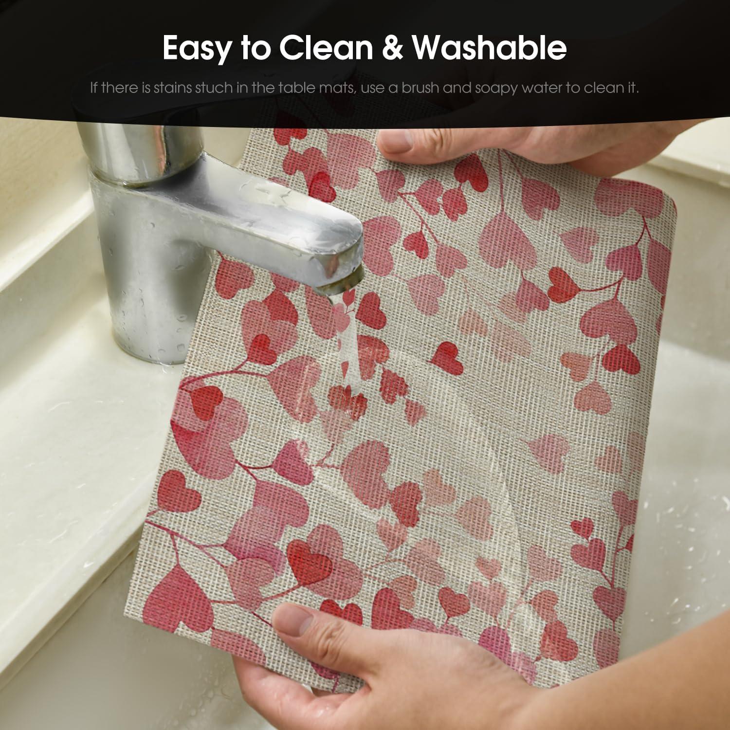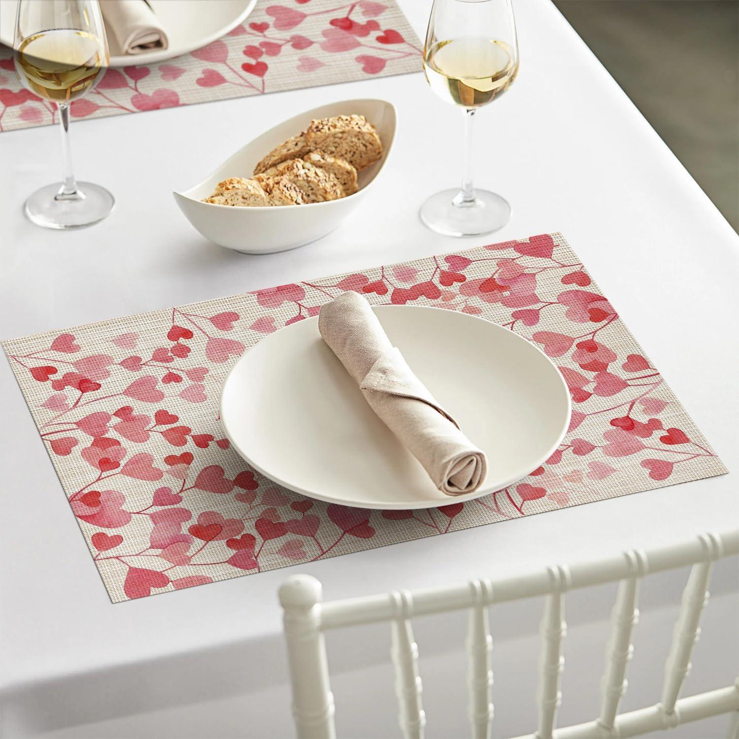 Artoid Mode Pink Hearts Vinyl Placemats Set of 4, 12×18 Inch Wipeable Non-Slip PVC Place Mats for Party Kitchen Dining Decor(Beige)